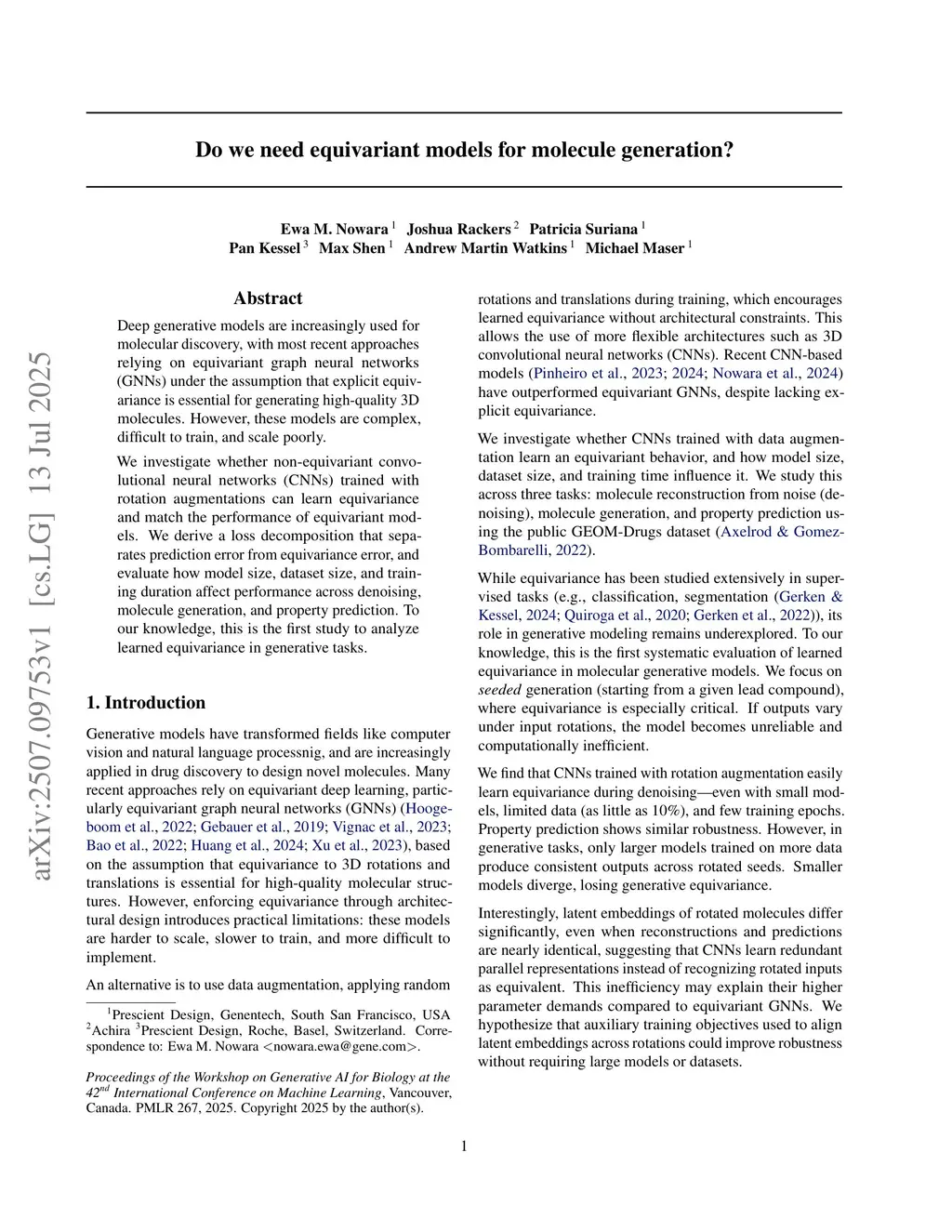 Deep generative models are increasingly used for molecular discovery, with most recent approaches relying on equivariant graph neural networks (GNNs) under the assumption that explicit equivariance is essential for generating high-quality 3D molecules. However, these models are complex, difficult to train, and scale poorly.We investigate whether non-equivariant convolutional neural networks (CNNs) trained with rotation augmentations can learn equivariance and match the performance of equivariant models. We derive a loss decomposition that separates prediction error from equivariance error, and evaluate how model size, dataset size, and training duration affect performance across denoising, molecule generation, and property prediction. To our knowledge, this is the first study to analyze learned equivariance in generative tasks.
