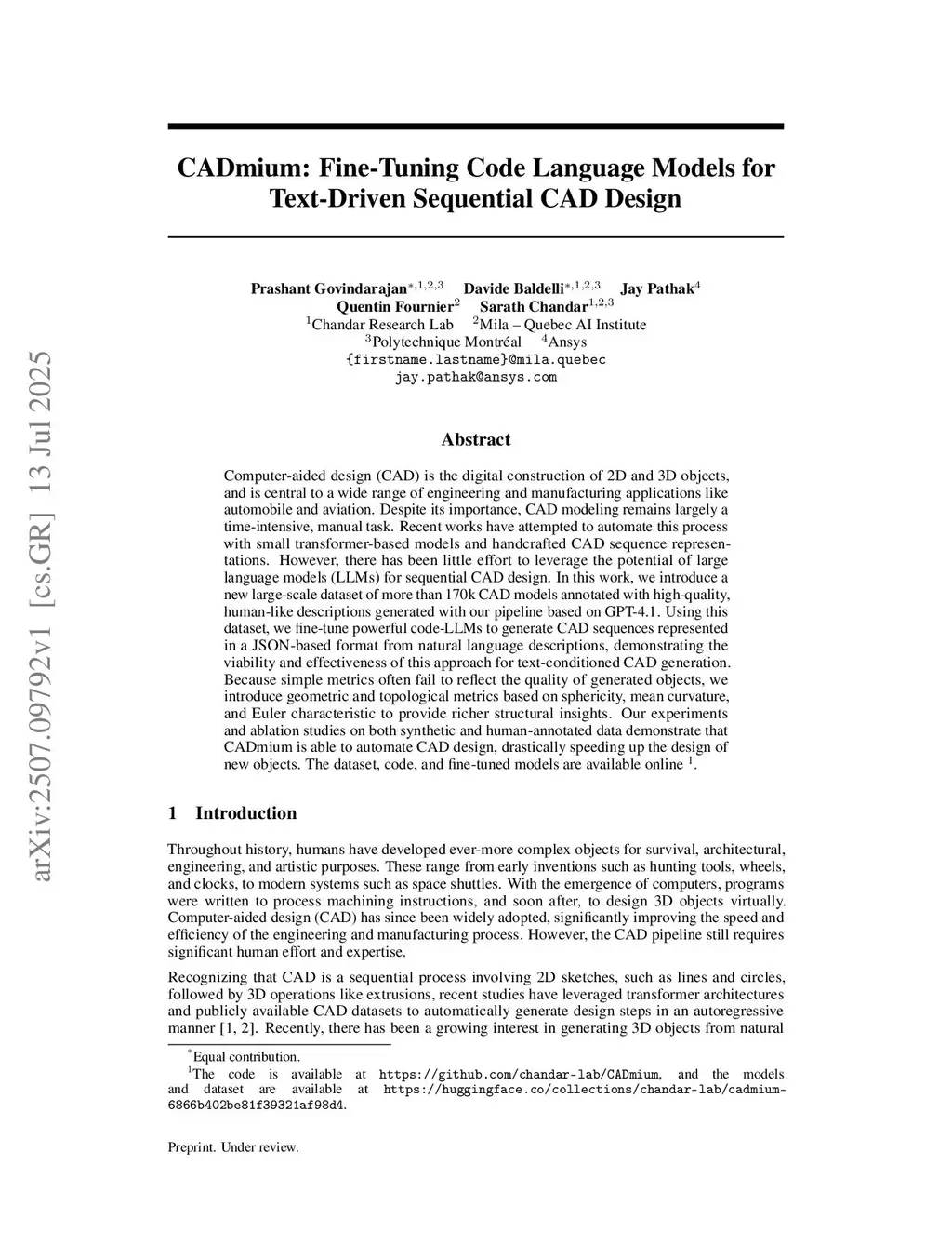 Computer-aided design (CAD) is the digital construction of 2D and 3D objects, and is central to a wide range of engineering and manufacturing applications like automobile and aviation. Despite its importance, CAD modeling remains largely a time-intensive, manual task. Recent works have attempted to automate this process with small transformer-based models and handcrafted CAD sequence representations. However, there has been little effort to leverage the potential of large language models (LLMs) for sequential CAD design. In this work, we introduce a new large-scale dataset of more than 170k CAD models annotated with high-quality, human-like descriptions generated with our pipeline based on GPT-4.1. Using this dataset, we fine-tune powerful code-LLMs to generate CAD sequences represented in a JSON-based format from natural language descriptions, demonstrating the viability and effectiveness of this approach for text-conditioned CAD generation. Because simple metrics often fail to reflect the quality of generated objects, we introduce geometric and topological metrics based on sphericity, mean curvature, and Euler characteristic to provide richer structural insights. Our experiments and ablation studies on both synthetic and human-annotated data demonstrate that CADmium is able to automate CAD design, drastically speeding up the design of new objects. The dataset, code, and fine-tuned models are available online.