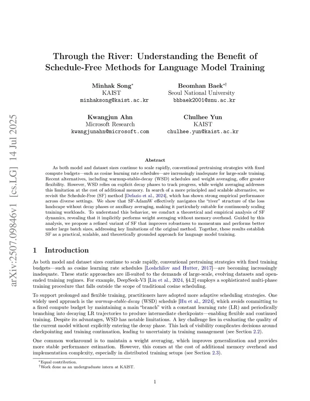 Through the River: Understanding the Benefit of Schedule-Free Methods for Language Model Training
