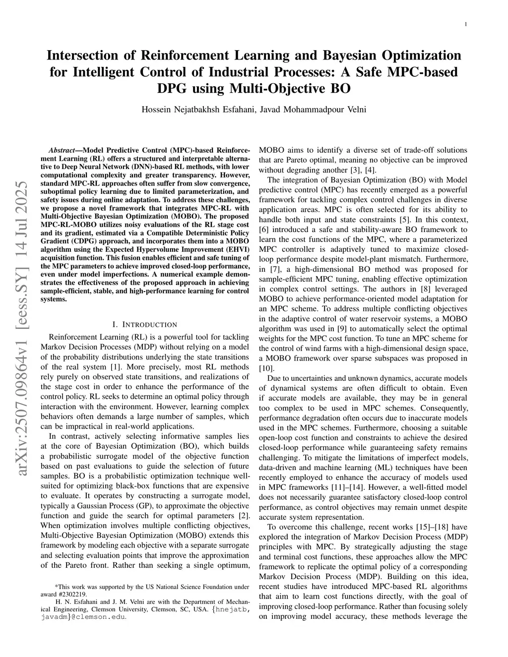 Intersection of Reinforcement Learning and Bayesian Optimization for Intelligent Control of Industrial Processes: A Safe MPC-based DPG using Multi-Objective BO