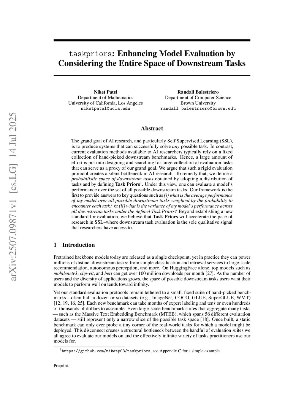 The grand goal of AI research, and particularly Self Supervised Learning (SSL), is to produce systems that can successfully solve any possible task. In contrast, current evaluation methods available to AI researchers typically rely on a fixed collection of hand-picked downstream benchmarks. Hence, a large amount of effort is put into designing and searching for large collection of evaluation tasks that can serve as a proxy of our grand goal. We argue that such a rigid evaluation protocol creates a silent bottleneck in AI research. To remedy that, we define a probabilistic space of downstream tasks obtained by adopting a distribution of tasks and by defining Task Priors. Under this view, one can evaluate a model's performance over the set of all possible downstream tasks. Our framework is the first to provide answers to key questions such as (i) what is the average performance of my model over all possible downstream tasks weighted by the probability to encounter each task? or (ii) what is the variance of my model's performance across all downstream tasks under the defined Task Priors? Beyond establishing a new standard for evaluation, we believe that Task Priors will accelerate the pace of research in SSL - where downstream task evaluation is the sole qualitative signal that researchers have access to.