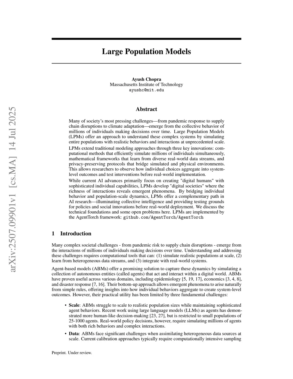 Many of society's most pressing challenges, from pandemic response to supply chain disruptions to climate adaptation, emerge from the collective behavior of millions of autonomous agents making decisions over time. Large Population Models (LPMs) offer an approach to understand these complex systems by simulating entire populations with realistic behaviors and interactions at unprecedented scale. LPMs extend traditional modeling approaches through three key innovations: computational methods that efficiently simulate millions of agents simultaneously, mathematical frameworks that learn from diverse real-world data streams, and privacy-preserving communication protocols that bridge virtual and physical environments. This allows researchers to observe how agent behavior aggregates into system-level outcomes and test interventions before real-world implementation. While current AI advances primarily focus on creating "digital humans" with sophisticated individual capabilities, LPMs develop "digital societies" where the richness of interactions reveals emergent phenomena. By bridging individual agent behavior and population-scale dynamics, LPMs offer a complementary path in AI research illuminating collective intelligence and providing testing grounds for policies and social innovations before real-world deployment. We discuss the technical foundations and some open problems here. LPMs are implemented by the AgentTorch framework (this http URL)