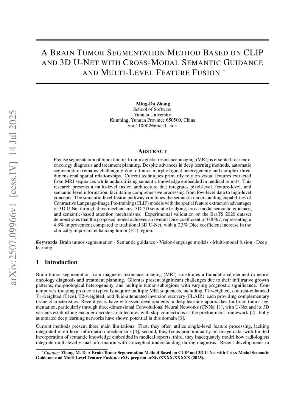 A Brain Tumor Segmentation Method Based on CLIP and 3D U-Net with Cross-Modal Semantic Guidance and Multi-Level Feature Fusion