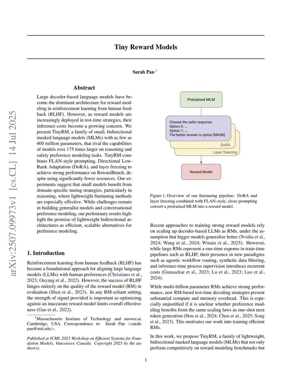 Large decoder-based language models have become the dominant architecture for reward modeling in reinforcement learning from human feedback (RLHF). However, as reward models are increasingly deployed in test-time strategies, their inference costs become a growing concern. We present TinyRM, a family of small, bidirectional masked language models (MLMs) with as few as 400 million parameters, that rival the capabilities of models over 175 times larger on reasoning and safety preference modeling tasks. TinyRM combines FLAN-style prompting, Directional Low-Rank Adaptation (DoRA), and layer freezing to achieve strong performance on RewardBench, despite using significantly fewer resources. Our experiments suggest that small models benefit from domain-specific tuning strategies, particularly in reasoning, where lightweight finetuning methods are especially effective. While challenges remain in building generalist models and conversational preference modeling, our preliminary results highlight the promise of lightweight bidirectional architectures as efficient, scalable alternatives for preference modeling.
