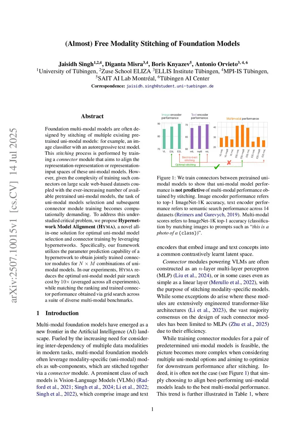 Foundation multi-modal models are often designed by stitching of multiple existing pretrained uni-modal models: for example, an image classifier with an text model. This stitching process is performed by training a connector module that aims to align the representation spaces of these uni-modal models towards a multi-modal objective. However, given the complexity of training such connectors on large scale web-based datasets coupled with the ever-increasing number of available pretrained uni-modal models, the task of uni-modal models selection and subsequent connector module training becomes computationally demanding. To address this under-studied critical problem, we propose Hypernetwork Model Alignment (Hyma), a novel all-in-one solution for optimal uni-modal model selection and connector training by leveraging hypernetworks. Specifically, our framework utilizes the parameter prediction capability of a hypernetwork to obtain jointly trained connector modules for combinations of uni-modal models. In our experiments, Hyma reduces the cost of searching for the best performing uni-modal model pair by , while matching the ranking and trained connector performance obtained via grid search across a suite of diverse multi-modal benchmarks.