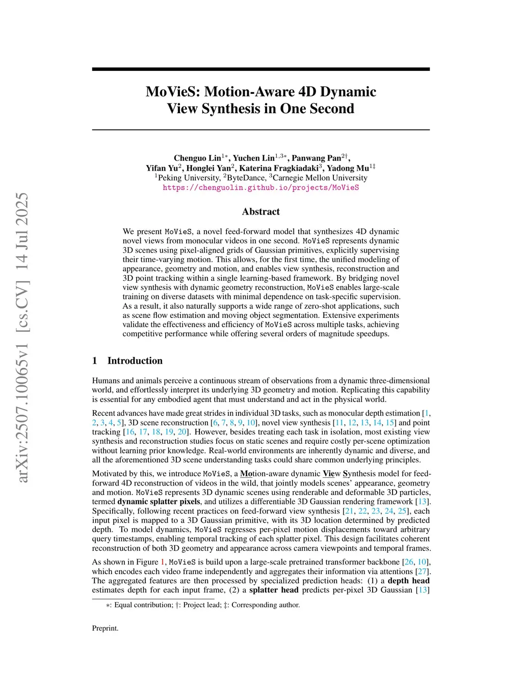 We present MoVieS, a Motion-aware View Synthesis model that reconstructs 4D dynamic scenes from monocular videos in one second. It represents dynamic 3D scenes with pixel-aligned Gaussian primitives and explicitly supervises their time-varying motions. This allows, for the first time, the unified modeling of appearance, geometry and motion from monocular videos, and enables reconstruction, view synthesis and 3D point tracking within a single learning-based framework. By bridging view synthesis with geometry reconstruction, MoVieS enables large-scale training on diverse datasets with minimal dependence on task-specific supervision. As a result, it also naturally supports a wide range of zero-shot applications, such as scene flow estimation and moving object segmentation. Extensive experiments validate the effectiveness and efficiency of MoVieS across multiple tasks, achieving competitive performance while offering several orders of magnitude speedups.