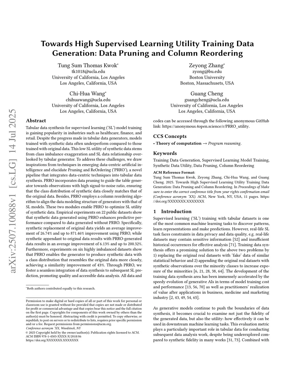 Towards High Supervised Learning Utility Training Data Generation: Data Pruning and Column Reordering