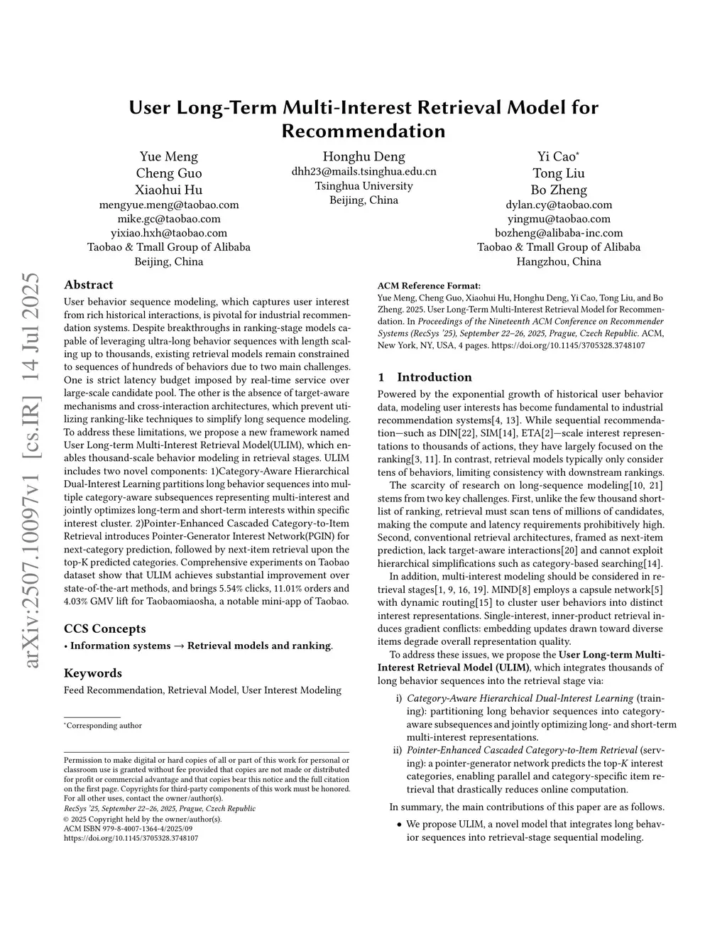User behavior sequence modeling, which captures user interest from rich historical interactions, is pivotal for industrial recommendation systems. Despite breakthroughs in ranking-stage models capable of leveraging ultra-long behavior sequences with length scaling up to thousands, existing retrieval models remain constrained to sequences of hundreds of behaviors due to two main challenges. One is strict latency budget imposed by real-time service over large-scale candidate pool. The other is the absence of target-aware mechanisms and cross-interaction architectures, which prevent utilizing ranking-like techniques to simplify long sequence modeling. To address these limitations, we propose a new framework named User Long-term Multi-Interest Retrieval Model(ULIM), which enables thousand-scale behavior modeling in retrieval stages. ULIM includes two novel components: 1)Category-Aware Hierarchical Dual-Interest Learning partitions long behavior sequences into multiple category-aware subsequences representing multi-interest and jointly optimizes long-term and short-term interests within specific interest cluster. 2)Pointer-Enhanced Cascaded Category-to-Item Retrieval introduces Pointer-Generator Interest Network(PGIN) for next-category prediction, followed by next-item retrieval upon the top-K predicted categories. Comprehensive experiments on Taobao dataset show that ULIM achieves substantial improvement over state-of-the-art methods, and brings 5.54% clicks, 11.01% orders and 4.03% GMV lift for Taobaomiaosha, a notable mini-app of Taobao.