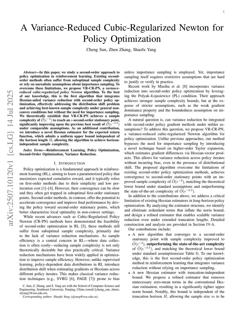 In this paper, we study a second-order approach to policy optimization in reinforcement learning. Existing second-order methods often suffer from suboptimal sample complexity or rely on unrealistic assumptions about importance sampling. To overcome these limitations, we propose VR-CR-PN, a variance-reduced cubic-regularized policy Newton algorithm. To the best of our knowledge, this is the first algorithm that integrates Hessian-aided variance reduction with second-order policy optimization, effectively addressing the distribution shift problem and achieving best-known sample complexity under general nonconvex conditions but without the need for importance sampling. We theoretically establish that VR-CR-PN achieves a sample complexity of to reach an -second-order stationary point, significantly improving upon the previous best result of under comparable assumptions. As an additional contribution, we introduce a novel Hessian estimator for the expected return function, which admits a uniform upper bound independent of the horizon length , allowing the algorithm to achieve horizon-independent sample complexity.