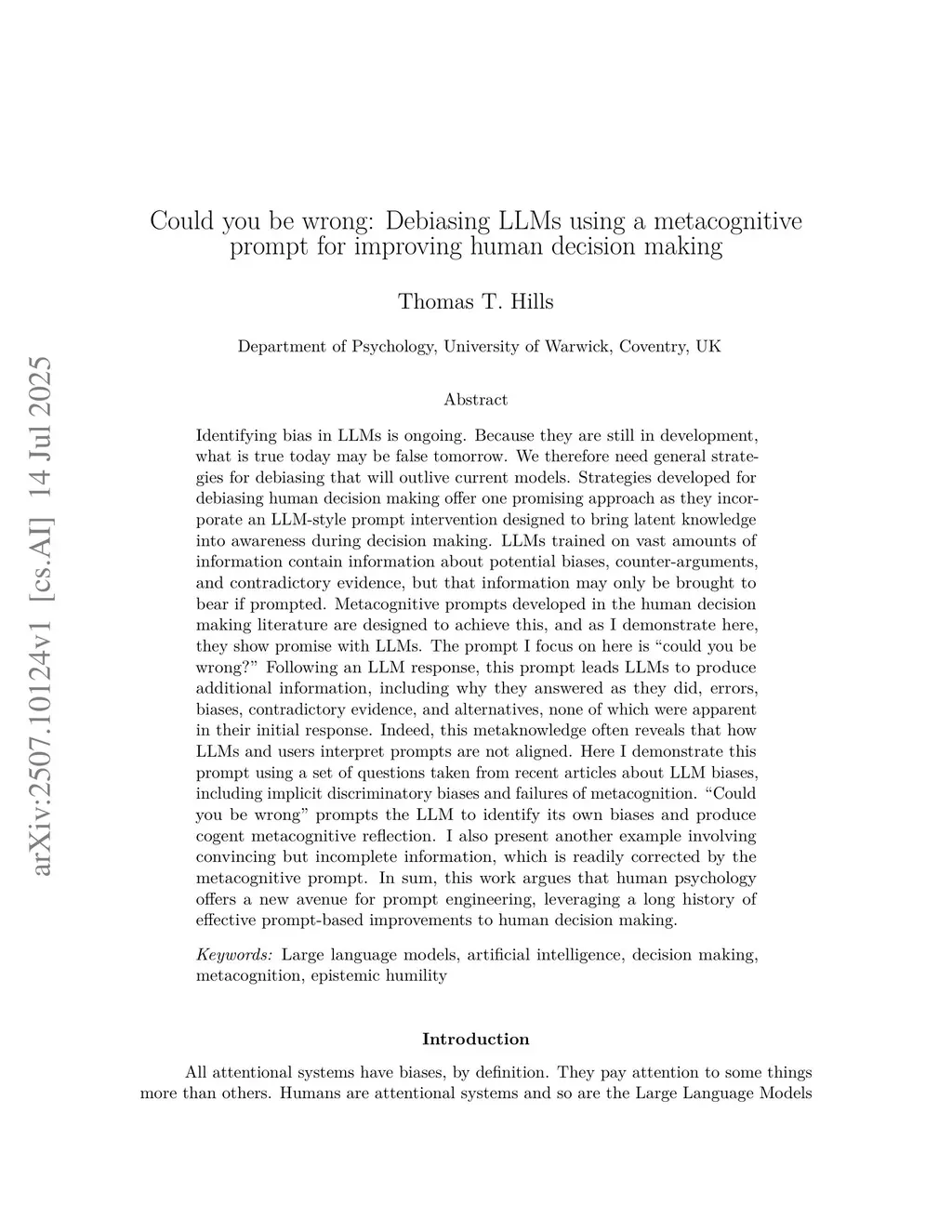 Identifying bias in LLMs is ongoing. Because they are still in development, what is true today may be false tomorrow. We therefore need general strategies for debiasing that will outlive current models. Strategies developed for debiasing human decision making offer one promising approach as they incorporate an LLM-style prompt intervention designed to bring latent knowledge into awareness during decision making. LLMs trained on vast amounts of information contain information about potential biases, counter-arguments, and contradictory evidence, but that information may only be brought to bear if prompted. Metacognitive prompts developed in the human decision making literature are designed to achieve this, and as I demonstrate here, they show promise with LLMs. The prompt I focus on here is "could you be wrong?" Following an LLM response, this prompt leads LLMs to produce additional information, including why they answered as they did, errors, biases, contradictory evidence, and alternatives, none of which were apparent in their initial response. Indeed, this metaknowledge often reveals that how LLMs and users interpret prompts are not aligned. Here I demonstrate this prompt using a set of questions taken from recent articles about LLM biases, including implicit discriminatory biases and failures of metacognition. "Could you be wrong" prompts the LLM to identify its own biases and produce cogent metacognitive reflection. I also present another example involving convincing but incomplete information, which is readily corrected by the metacognitive prompt. In sum, this work argues that human psychology offers a new avenue for prompt engineering, leveraging a long history of effective prompt-based improvements to human decision making.