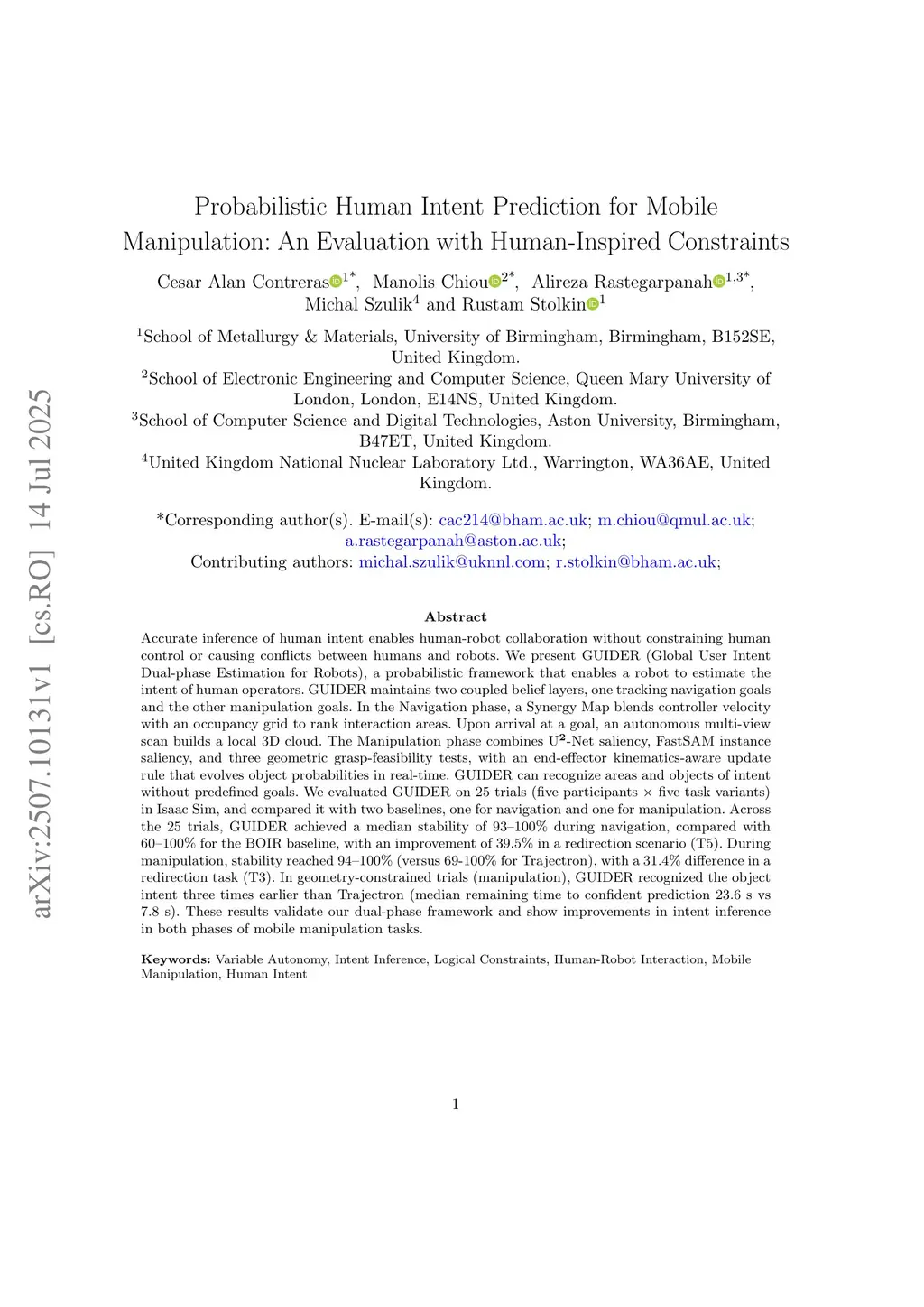 Accurate inference of human intent enables human-robot collaboration without constraining human control or causing conflicts between humans and robots. We present GUIDER (Global User Intent Dual-phase Estimation for Robots), a probabilistic framework that enables a robot to estimate the intent of human operators. GUIDER maintains two coupled belief layers, one tracking navigation goals and the other manipulation goals. In the Navigation phase, a Synergy Map blends controller velocity with an occupancy grid to rank interaction areas. Upon arrival at a goal, an autonomous multi-view scan builds a local 3D cloud. The Manipulation phase combines U2Net saliency, FastSAM instance saliency, and three geometric grasp-feasibility tests, with an end-effector kinematics-aware update rule that evolves object probabilities in real-time. GUIDER can recognize areas and objects of intent without predefined goals. We evaluated GUIDER on 25 trials (five participants x five task variants) in Isaac Sim, and compared it with two baselines, one for navigation and one for manipulation. Across the 25 trials, GUIDER achieved a median stability of 93-100% during navigation, compared with 60-100% for the BOIR baseline, with an improvement of 39.5% in a redirection scenario (T5). During manipulation, stability reached 94-100% (versus 69-100% for Trajectron), with a 31.4% difference in a redirection task (T3). In geometry-constrained trials (manipulation), GUIDER recognized the object intent three times earlier than Trajectron (median remaining time to confident prediction 23.6 s vs 7.8 s). These results validate our dual-phase framework and show improvements in intent inference in both phases of mobile manipulation tasks.