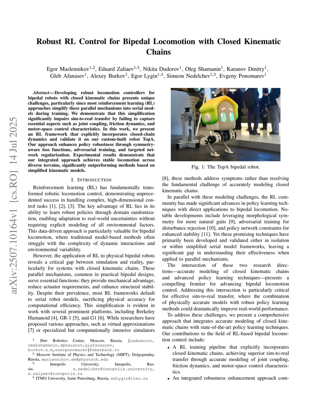 Developing robust locomotion controllers for bipedal robots with closed kinematic chains presents unique challenges, particularly since most reinforcement learning (RL) approaches simplify these parallel mechanisms into serial models during training. We demonstrate that this simplification significantly impairs sim-to-real transfer by failing to capture essential aspects such as joint coupling, friction dynamics, and motor-space control characteristics. In this work, we present an RL framework that explicitly incorporates closed-chain dynamics and validate it on our custom-built robot TopA. Our approach enhances policy robustness through symmetry-aware loss functions, adversarial training, and targeted network regularization. Experimental results demonstrate that our integrated approach achieves stable locomotion across diverse terrains, significantly outperforming methods based on simplified kinematic models.