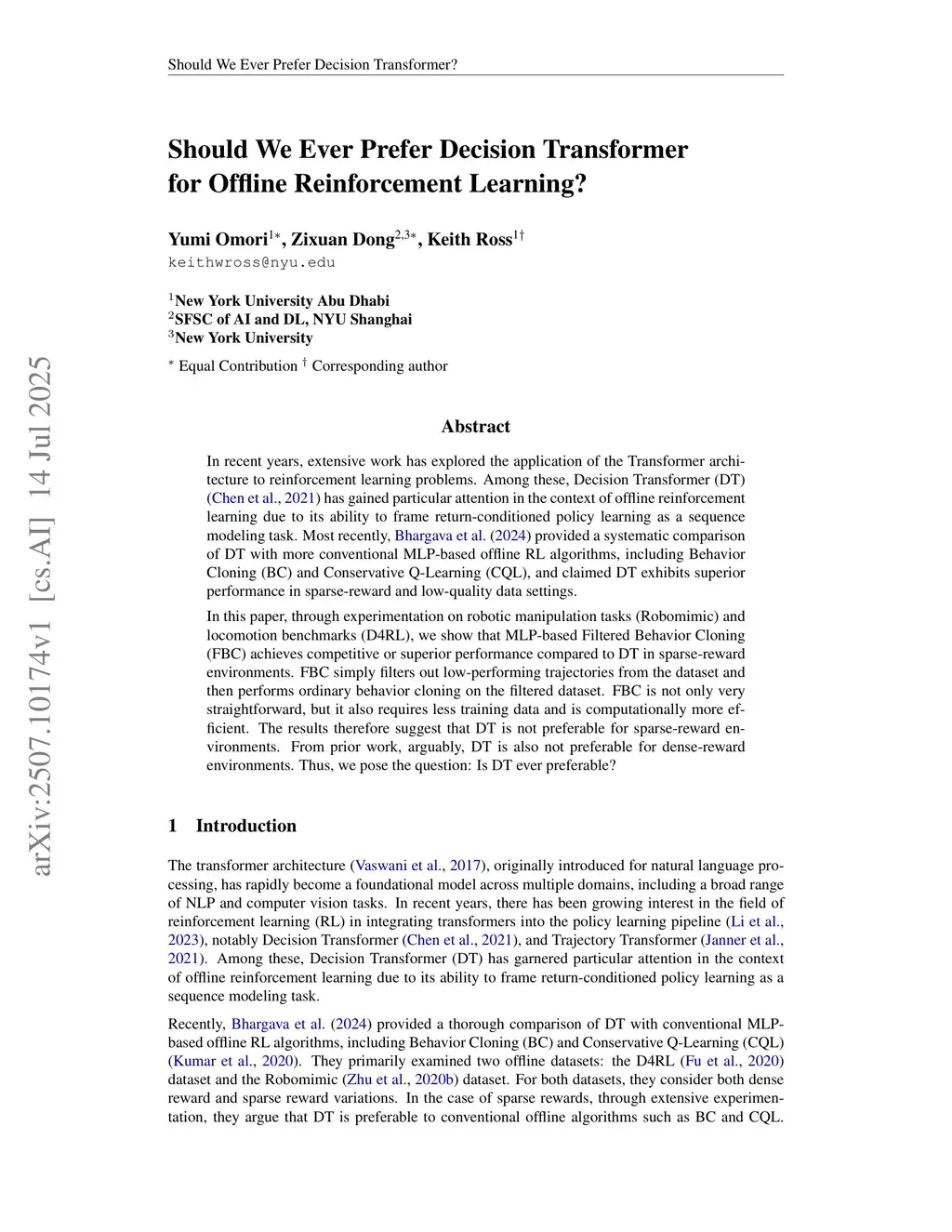 In recent years, extensive work has explored the application of the Transformer architecture to reinforcement learning problems. Among these, Decision Transformer (DT) has gained particular attention in the context of offline reinforcement learning due to its ability to frame return-conditioned policy learning as a sequence modeling task. Most recently, Bhargava et al. (2024) provided a systematic comparison of DT with more conventional MLP-based offline RL algorithms, including Behavior Cloning (BC) and Conservative Q-Learning (CQL), and claimed that DT exhibits superior performance in sparse-reward and low-quality data settings.In this paper, through experimentation on robotic manipulation tasks (Robomimic) and locomotion benchmarks (D4RL), we show that MLP-based Filtered Behavior Cloning (FBC) achieves competitive or superior performance compared to DT in sparse-reward environments. FBC simply filters out low-performing trajectories from the dataset and then performs ordinary behavior cloning on the filtered dataset. FBC is not only very straightforward, but it also requires less training data and is computationally more efficient. The results therefore suggest that DT is not preferable for sparse-reward environments. From prior work, arguably, DT is also not preferable for dense-reward environments. Thus, we pose the question: Is DT ever preferable?