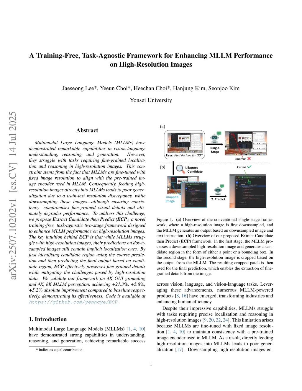 Multimodal Large Language Models (MLLMs) have demonstrated remarkable capabilities in vision-language understanding, reasoning, and generation. However, they struggle with tasks requiring fine-grained localization and reasoning in high-resolution images. This constraint stems from the fact that MLLMs are fine-tuned with fixed image resolution to align with the pre-trained image encoder used in MLLM. Consequently, feeding high-resolution images directly into MLLMs leads to poor generalization due to a train-test resolution discrepancy, while downsampling these images-although ensuring consistency-compromises fine-grained visual details and ultimately degrades performance. To address this challenge, we propose Extract Candidate then Predict (ECP), a novel training-free, task-agnostic two-stage framework designed to enhance MLLM performance on high-resolution images. The key intuition behind ECP is that while MLLMs struggle with high-resolution images, their predictions on downsampled images still contain implicit localization cues. By first identifying candidate region using the coarse prediction and then predicting the final output based on candidate region, ECP effectively preserves fine-grained details while mitigating the challenges posed by high-resolution data. We validate our framework on 4K GUI grounding and 4K, 8K MLLM perception, achieving +21.3%, +5.8%, +5.2% absolute improvement compared to baseline respectively, demonstrating its effectiveness. Code is available atthis https URL.