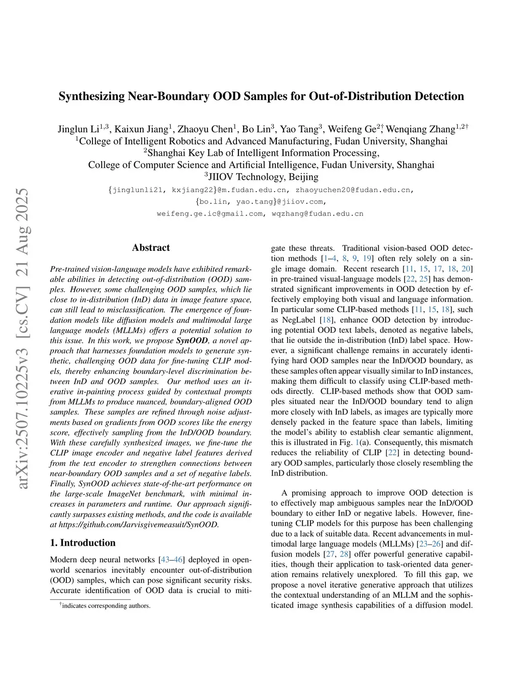 Pre-trained vision-language models have exhibited remarkable abilities in detecting out-of-distribution (OOD) samples. However, some challenging OOD samples, which lie close to in-distribution (InD) data in image feature space, can still lead to misclassification. The emergence of foundation models like diffusion models and multimodal large language models (MLLMs) offers a potential solution to this issue. In this work, we propose SynOOD, a novel approach that harnesses foundation models to generate synthetic, challenging OOD data for fine-tuning CLIP models, thereby enhancing boundary-level discrimination between InD and OOD samples. Our method uses an iterative in-painting process guided by contextual prompts from MLLMs to produce nuanced, boundary-aligned OOD samples. These samples are refined through noise adjustments based on gradients from OOD scores like the energy score, effectively sampling from the InD/OOD boundary. With these carefully synthesized images, we fine-tune the CLIP image encoder and negative label features derived from the text encoder to strengthen connections between near-boundary OOD samples and a set of negative labels. Finally, SynOOD achieves state-of-the-art performance on the large-scale ImageNet benchmark, with minimal increases in parameters and runtime. Our approach significantly surpasses existing methods, and the code is available atthis https URL.