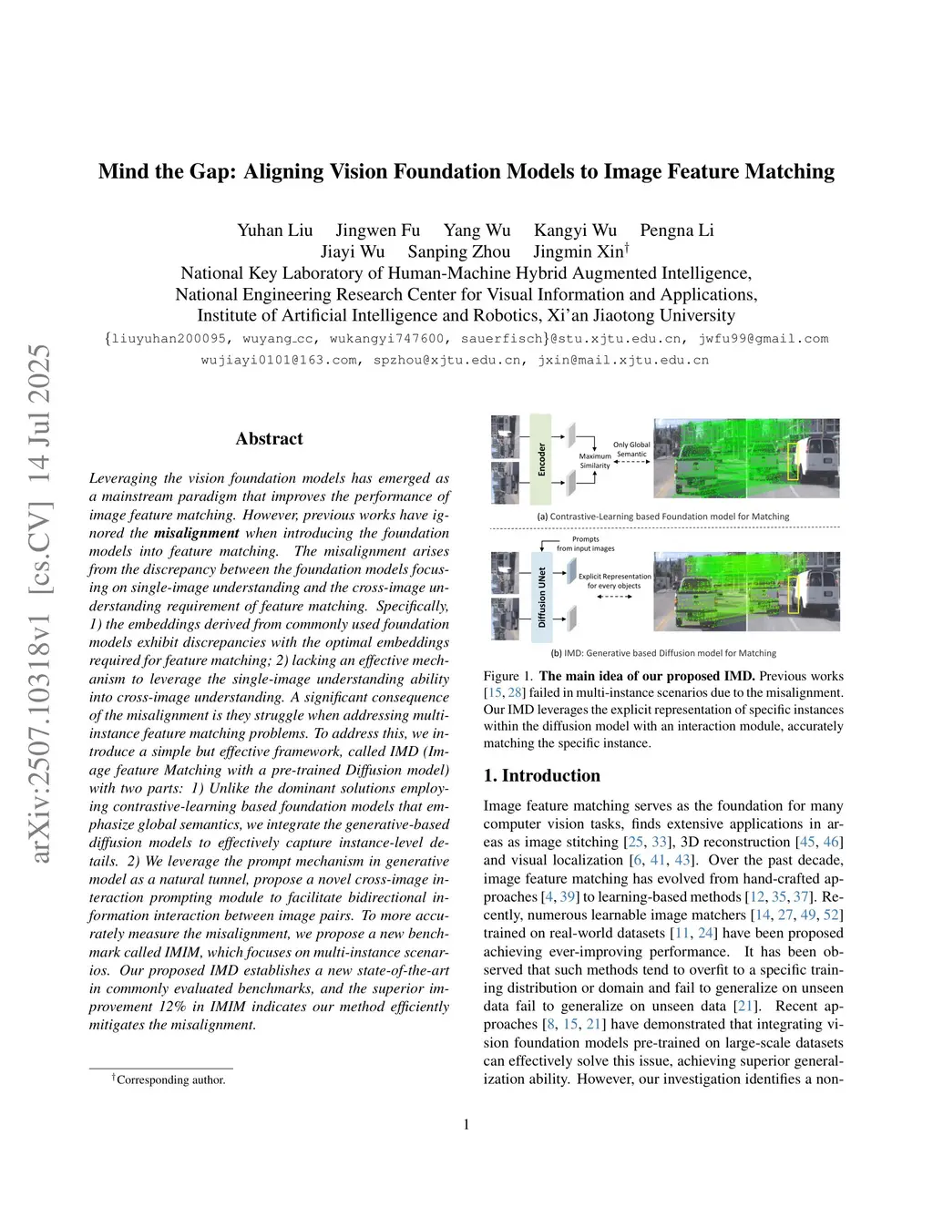 Leveraging the vision foundation models has emerged as a mainstream paradigm that improves the performance of image feature matching. However, previous works have ignored the misalignment when introducing the foundation models into feature matching. The misalignment arises from the discrepancy between the foundation models focusing on single-image understanding and the cross-image understanding requirement of feature matching. Specifically, 1) the embeddings derived from commonly used foundation models exhibit discrepancies with the optimal embeddings required for feature matching; 2) lacking an effective mechanism to leverage the single-image understanding ability into cross-image understanding. A significant consequence of the misalignment is they struggle when addressing multi-instance feature matching problems. To address this, we introduce a simple but effective framework, called IMD (Image feature Matching with a pre-trained Diffusion model) with two parts: 1) Unlike the dominant solutions employing contrastive-learning based foundation models that emphasize global semantics, we integrate the generative-based diffusion models to effectively capture instance-level details. 2) We leverage the prompt mechanism in generative model as a natural tunnel, propose a novel cross-image interaction prompting module to facilitate bidirectional information interaction between image pairs. To more accurately measure the misalignment, we propose a new benchmark called IMIM, which focuses on multi-instance scenarios. Our proposed IMD establishes a new state-of-the-art in commonly evaluated benchmarks, and the superior improvement 12% in IMIM indicates our method efficiently mitigates the misalignment.
