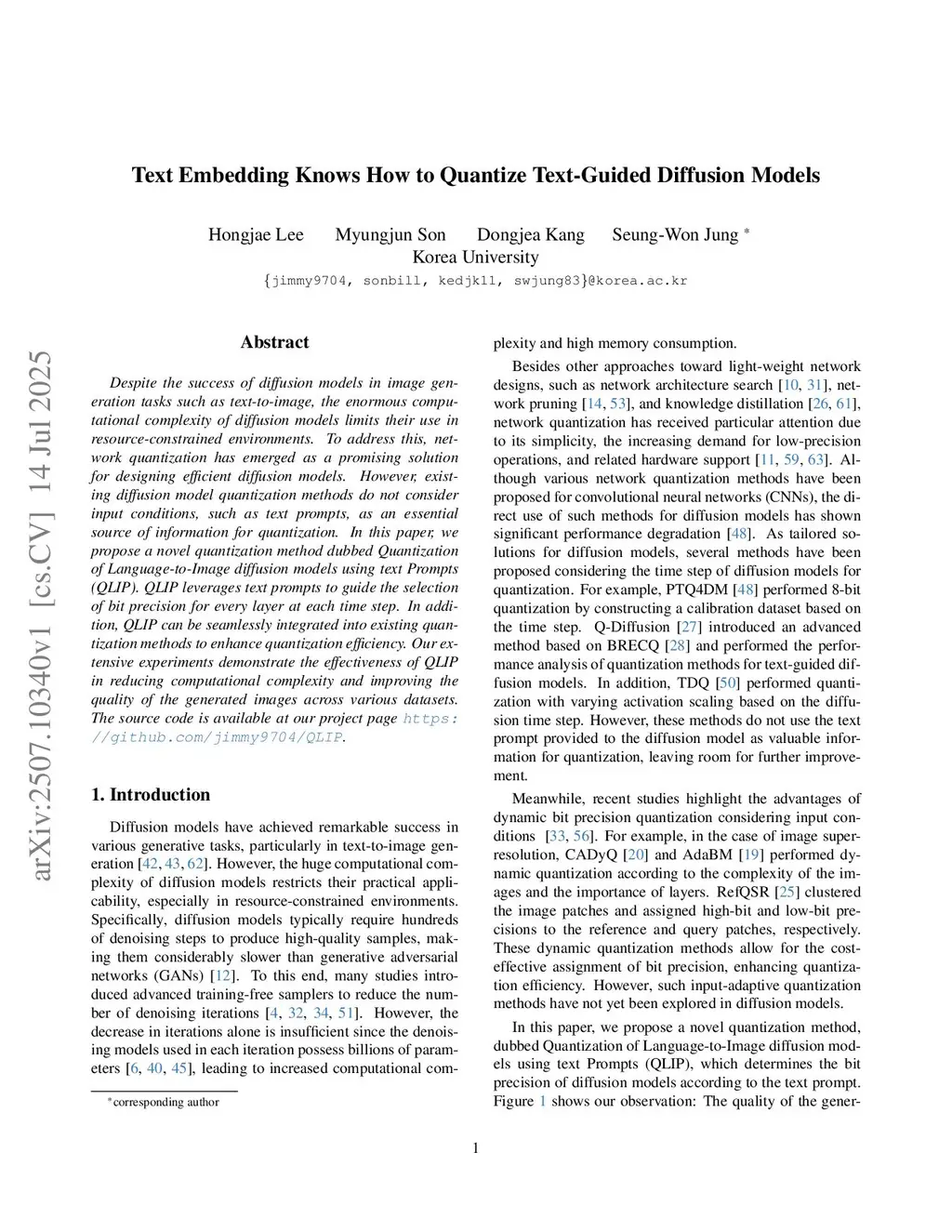 Despite the success of diffusion models in image generation tasks such as text-to-image, the enormous computational complexity of diffusion models limits their use in resource-constrained environments. To address this, network quantization has emerged as a promising solution for designing efficient diffusion models. However, existing diffusion model quantization methods do not consider input conditions, such as text prompts, as an essential source of information for quantization. In this paper, we propose a novel quantization method dubbed Quantization of Language-to-Image diffusion models using text Prompts (QLIP). QLIP leverages text prompts to guide the selection of bit precision for every layer at each time step. In addition, QLIP can be seamlessly integrated into existing quantization methods to enhance quantization efficiency. Our extensive experiments demonstrate the effectiveness of QLIP in reducing computational complexity and improving the quality of the generated images across various datasets.