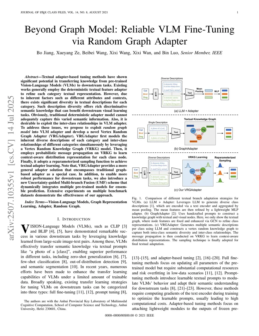 Textual adapter-based tuning methods have shown significant potential in transferring knowledge from pre-trained Vision-Language Models (VLMs) to downstream tasks. Existing works generally employ the deterministic textual feature adapter to refine each category textual representation. However, due to inherent factors such as different attributes and contexts, there exists significant diversity in textual descriptions for each category. Such description diversity offers rich discriminative semantic knowledge that can benefit downstream visual learning tasks. Obviously, traditional deterministic adapter model cannot adequately capture this varied semantic information. Also, it is desirable to exploit the inter-class relationships in VLM adapter. To address these issues, we propose to exploit random graph model into VLM adapter and develop a novel Vertex Random Graph Adapter (VRGAdapter). VRGAdapter first models the inherent diverse descriptions of each category and inter-class relationships of different categories simultaneously by leveraging a Vertex Random Knowledge Graph (VRKG) model. Then, it employs probabilistic message propagation on VRKG to learn context-aware distribution representation for each class node. Finally, it adopts a reparameterized sampling function to achieve textual adapter learning. Note that, VRGAdapter provides a more general adapter solution that encompasses traditional graph-based adapter as a special case. In addition, to enable more robust performance for downstream tasks, we also introduce a new Uncertainty-guided Multi-branch Fusion (UMF) scheme that dynamically integrates multiple pre-trained models for ensemble prediction. Extensive experiments on multiple benchmark datasets demonstrate the effectiveness of our approach.