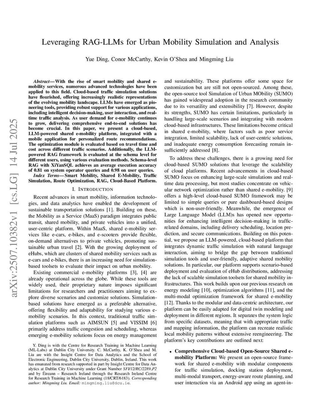 With the rise of smart mobility and shared e-mobility services, numerous advanced technologies have been applied to this field. Cloud-based traffic simulation solutions have flourished, offering increasingly realistic representations of the evolving mobility landscape. LLMs have emerged as pioneering tools, providing robust support for various applications, including intelligent decision-making, user interaction, and real-time traffic analysis. As user demand for e-mobility continues to grow, delivering comprehensive end-to-end solutions has become crucial. In this paper, we present a cloud-based, LLM-powered shared e-mobility platform, integrated with a mobile application for personalized route recommendations. The optimization module is evaluated based on travel time and cost across different traffic scenarios. Additionally, the LLM-powered RAG framework is evaluated at the schema level for different users, using various evaluation methods. Schema-level RAG with XiYanSQL achieves an average execution accuracy of 0.81 on system operator queries and 0.98 on user queries.