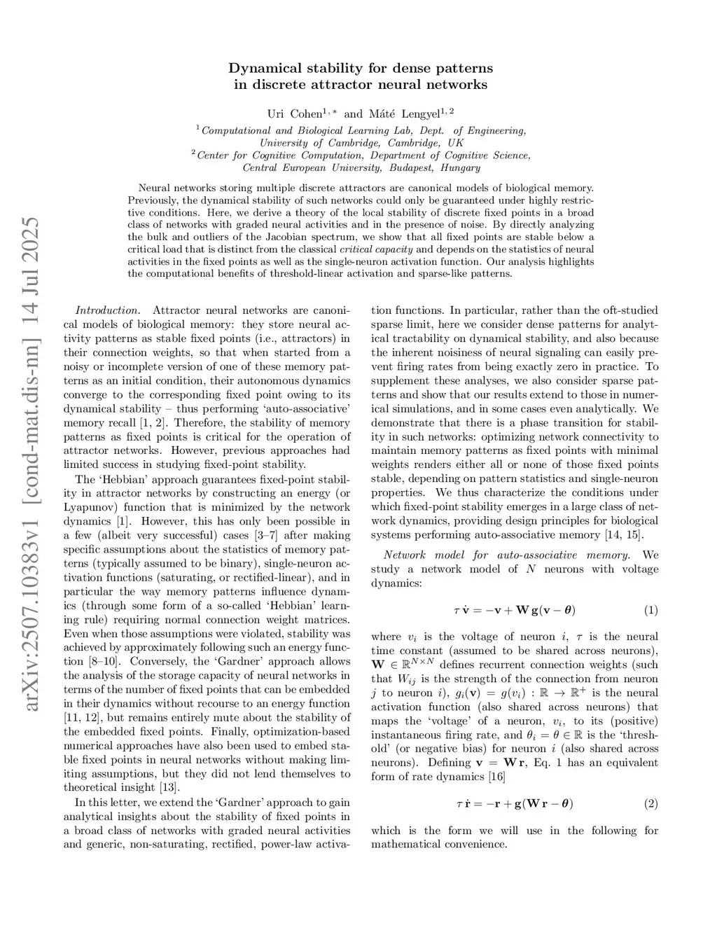Neural networks storing multiple discrete attractors are canonical models of biological memory. Previously, the dynamical stability of such networks could only be guaranteed under highly restrictive conditions. Here, we derive a theory of the local stability of discrete fixed points in a broad class of networks with graded neural activities and in the presence of noise. By directly analyzing the bulk and the outliers of the Jacobian spectrum, we show that all fixed points are stable below a critical load that is distinct from the classical \textit{critical capacity} and depends on the statistics of neural activities in the fixed points as well as the single-neuron activation function. Our analysis highlights the computational benefits of threshold-linear activation and sparse-like patterns.
