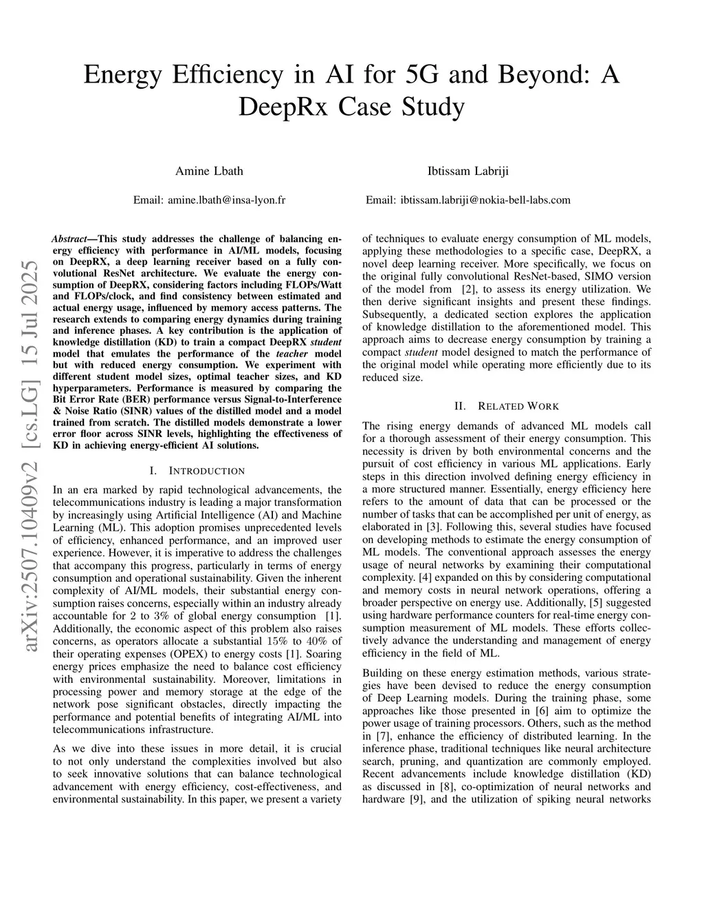 This study addresses the challenge of balancing energy efficiency with performance in AI/ML models, focusing on DeepRX, a deep learning receiver based on a fully convolutional ResNet architecture. We evaluate the energy consumption of DeepRX, considering factors including FLOPs/Watt and FLOPs/clock, and find consistency between estimated and actual energy usage, influenced by memory access patterns. The research extends to comparing energy dynamics during training and inference phases. A key contribution is the application of knowledge distillation (KD) to train a compact DeepRX student model that emulates the performance of the teacher model but with reduced energy consumption. We experiment with different student model sizes, optimal teacher sizes, and KD hyperparameters. Performance is measured by comparing the Bit Error Rate (BER) performance versus Signal-to-Interference & Noise Ratio (SINR) values of the distilled model and a model trained from scratch. The distilled models demonstrate a lower error floor across SINR levels, highlighting the effectiveness of KD in achieving energy-efficient AI solutions.