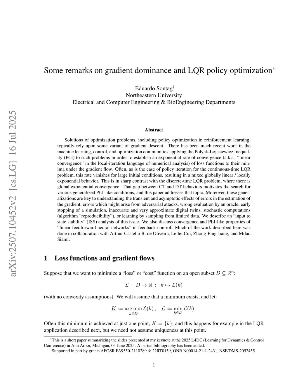 Solutions of optimization problems, including policy optimization in reinforcement learning, typically rely upon some variant of gradient descent. There has been much recent work in the machine learning, control, and optimization communities applying the Polyak-Łojasiewicz Inequality (PLI) to such problems in order to establish an exponential rate of convergence (a.k.a. ``linear convergence'' in the local-iteration language of numerical analysis) of loss functions to their minima under the gradient flow. Often, as is the case of policy iteration for the continuous-time LQR problem, this rate vanishes for large initial conditions, resulting in a mixed globally linear / locally exponential behavior. This is in sharp contrast with the discrete-time LQR problem, where there is global exponential convergence. That gap between CT and DT behaviors motivates the search for various generalized PLI-like conditions, and this talk will address that topic. Moreover, these generalizations are key to understanding the transient and asymptotic effects of errors in the estimation of the gradient, errors which might arise from adversarial attacks, wrong evaluation by an oracle, early stopping of a simulation, inaccurate and very approximate digital twins, stochastic computations (algorithm ``reproducibility''), or learning by sampling from limited data. We describe an ``input to state stability'' (ISS) analysis of this issue. The second part discusses convergence and PLI-like properties of ``linear feedforward neural networks'' in feedback control. Much of the work described here was done in collaboration with Arthur Castello B. de Oliveira, Leilei Cui, Zhong-Ping Jiang, and Milad Siami.