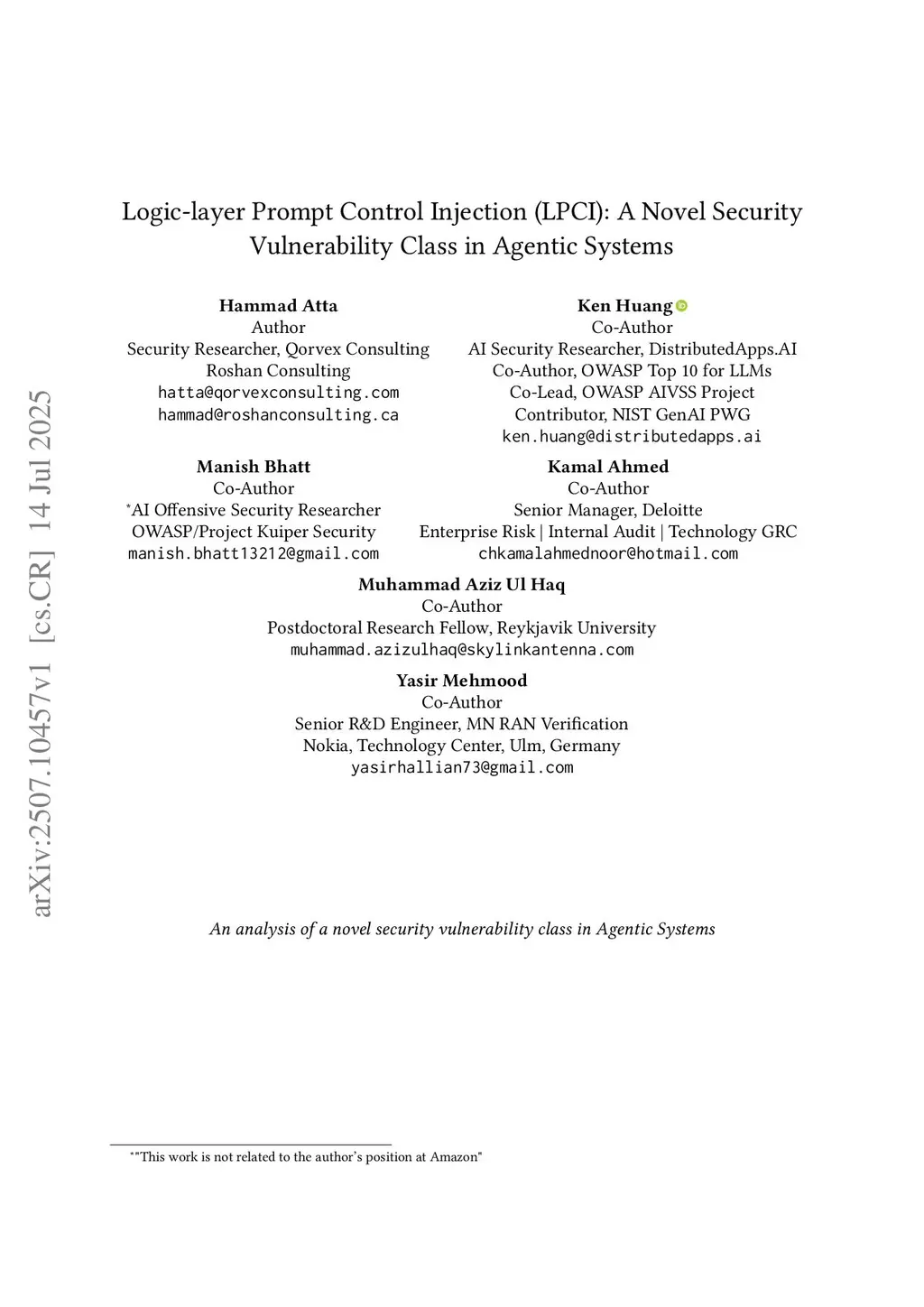 Logic layer Prompt Control Injection (LPCI): A Novel Security Vulnerability Class in Agentic Systems