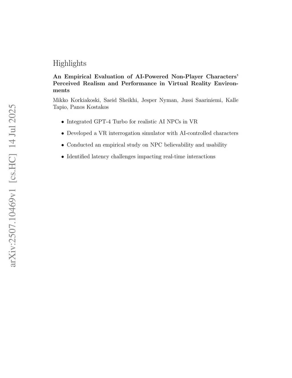 Advancements in artificial intelligence (AI) have significantly enhanced the realism and interactivity of non-player characters (NPCs) in virtual reality (VR), creating more engaging and believable user experiences. This paper evaluates AI-driven NPCs within a VR interrogation simulator, focusing on their perceived realism, usability, and system performance. The simulator features two AI-powered NPCs, a suspect, and a partner, using GPT-4 Turbo to engage participants in a scenario to determine the suspect's guilt or innocence. A user study with 18 participants assessed the system using the System Usability Scale (SUS), Game Experience Questionnaire (GEQ), and a Virtual Agent Believability Questionnaire, alongside latency measurements for speech-to-text (STT), text-to-speech (TTS), OpenAI GPT-4 Turbo, and overall (cycle) latency. Results showed an average cycle latency of 7 seconds, influenced by the increasing conversational context. Believability scored 6.67 out of 10, with high ratings in behavior, social relationships, and intelligence but moderate scores in emotion and personality. The system achieved a SUS score of 79.44, indicating good usability. These findings demonstrate the potential of large language models to improve NPC realism and interaction in VR while highlighting challenges in reducing system latency and enhancing emotional depth. This research contributes to the development of more sophisticated AI-driven NPCs, revealing the need for performance optimization to achieve increasingly immersive virtual experiences.