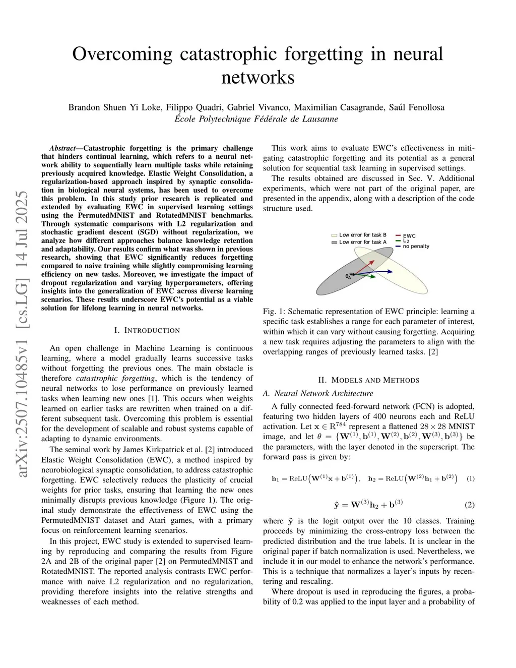 Catastrophic forgetting is the primary challenge that hinders continual learning, which refers to a neural network ability to sequentially learn multiple tasks while retaining previously acquired knowledge. Elastic Weight Consolidation, a regularization-based approach inspired by synaptic consolidation in biological neural systems, has been used to overcome this problem. In this study prior research is replicated and extended by evaluating EWC in supervised learning settings using the PermutedMNIST and RotatedMNIST benchmarks. Through systematic comparisons with L2 regularization and stochastic gradient descent (SGD) without regularization, we analyze how different approaches balance knowledge retention and adaptability. Our results confirm what was shown in previous research, showing that EWC significantly reduces forgetting compared to naive training while slightly compromising learning efficiency on new tasks. Moreover, we investigate the impact of dropout regularization and varying hyperparameters, offering insights into the generalization of EWC across diverse learning scenarios. These results underscore EWC's potential as a viable solution for lifelong learning in neural networks.
