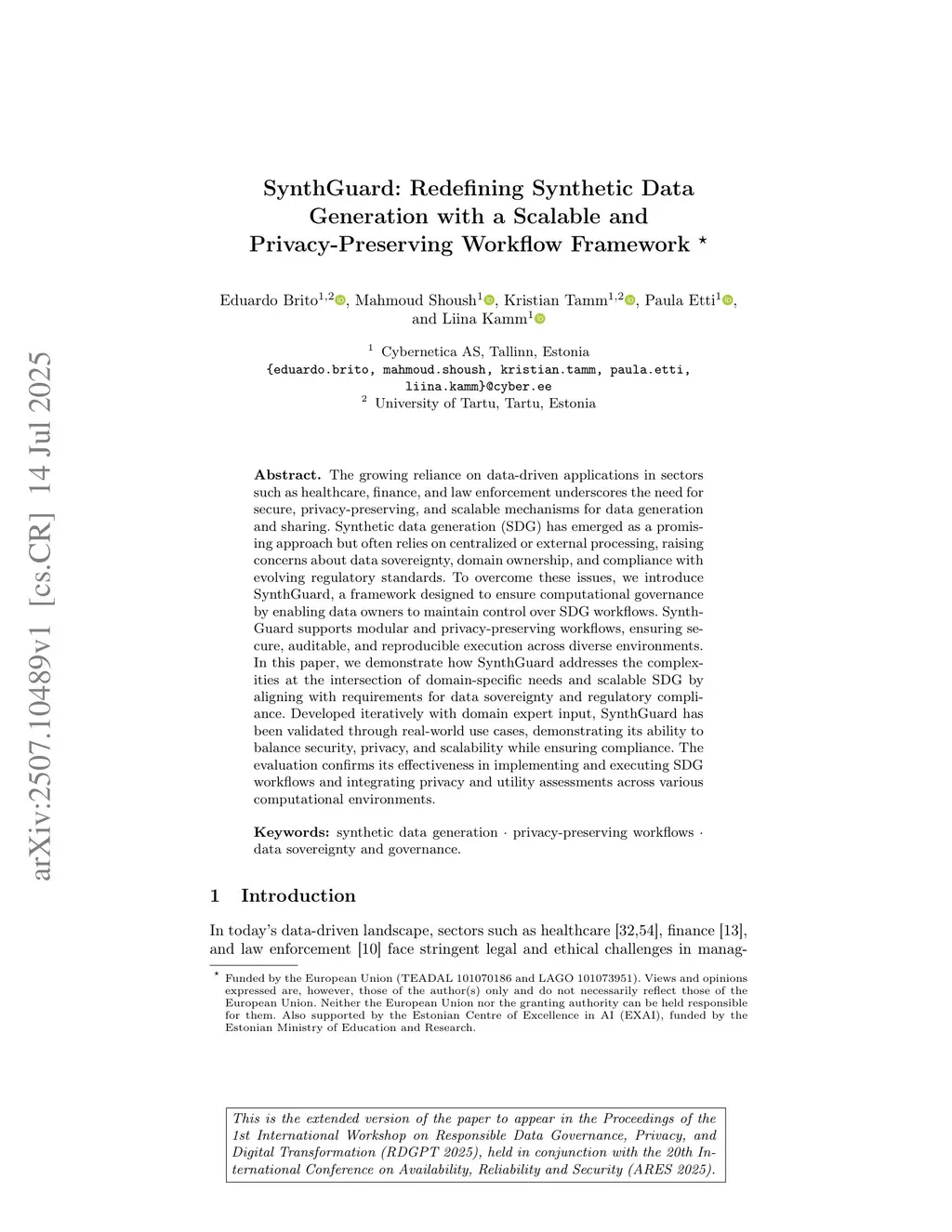 The growing reliance on data-driven applications in sectors such as healthcare, finance, and law enforcement underscores the need for secure, privacy-preserving, and scalable mechanisms for data generation and sharing. Synthetic data generation (SDG) has emerged as a promising approach but often relies on centralized or external processing, raising concerns about data sovereignty, domain ownership, and compliance with evolving regulatory standards. To overcome these issues, we introduce SynthGuard, a framework designed to ensure computational governance by enabling data owners to maintain control over SDG workflows. SynthGuard supports modular and privacy-preserving workflows, ensuring secure, auditable, and reproducible execution across diverse environments. In this paper, we demonstrate how SynthGuard addresses the complexities at the intersection of domain-specific needs and scalable SDG by aligning with requirements for data sovereignty and regulatory compliance. Developed iteratively with domain expert input, SynthGuard has been validated through real-world use cases, demonstrating its ability to balance security, privacy, and scalability while ensuring compliance. The evaluation confirms its effectiveness in implementing and executing SDG workflows and integrating privacy and utility assessments across various computational environments.