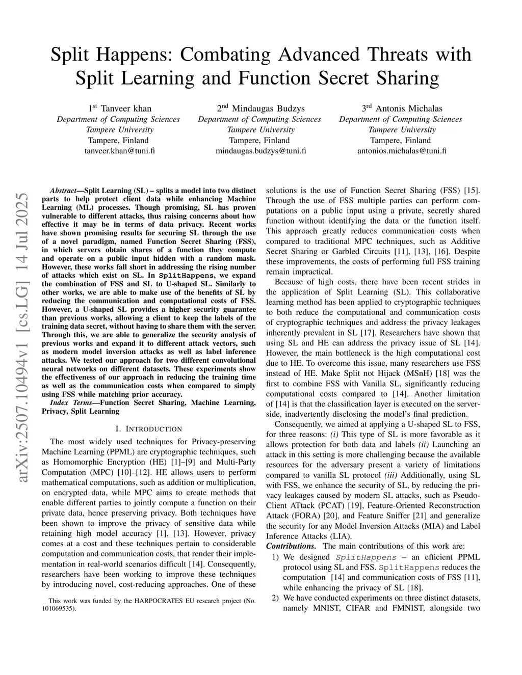 Split Happens: Combating Advanced Threats with Split Learning and Function Secret Sharing