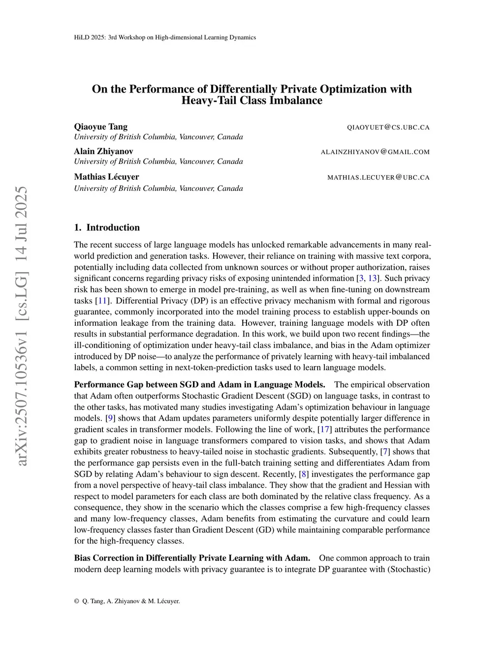 In this work, we analyze the optimization behaviour of common private learning optimization algorithms under heavy-tail class imbalanced distribution. We show that, in a stylized model, optimizing with Gradient Descent with differential privacy (DP-GD) suffers when learning low-frequency classes, whereas optimization algorithms that estimate second-order information do not. In particular, DP-AdamBC that removes the DP bias from estimating loss curvature is a crucial component to avoid the ill-condition caused by heavy-tail class imbalance, and empirically fits the data better with and increase in training accuracy when learning the least frequent classes on both controlled experiments and real data respectively.