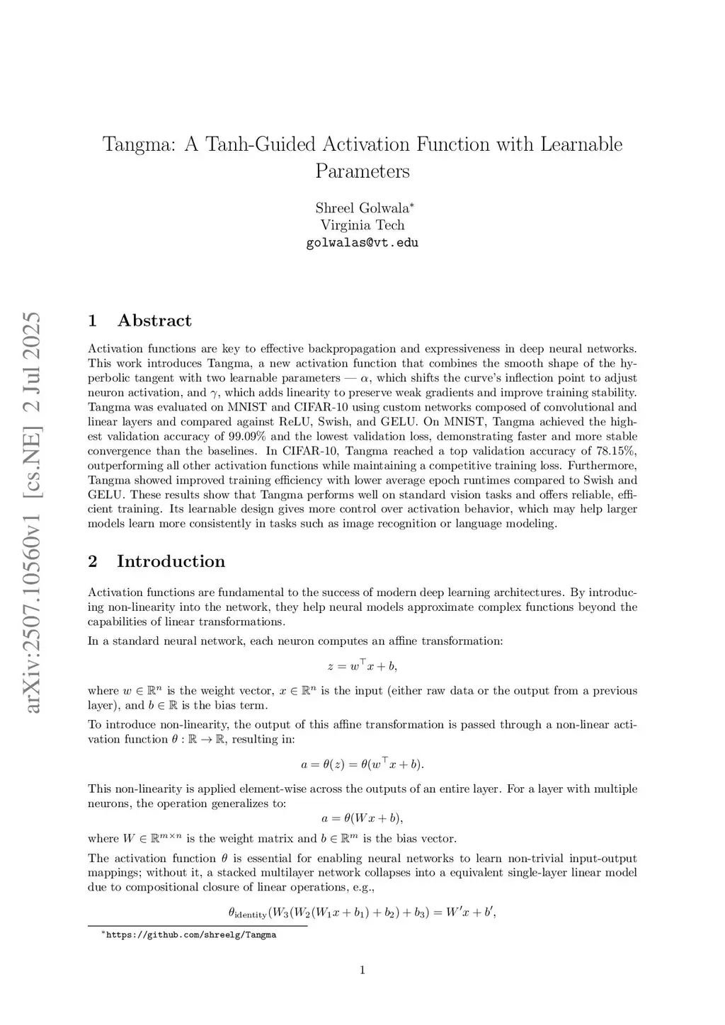 Activation functions are key to effective backpropagation and expressiveness in deep neural networks. This work introduces Tangma, a new activation function that combines the smooth shape of the hyperbolic tangent with two learnable parameters: , which shifts the curve's inflection point to adjust neuron activation, and , which adds linearity to preserve weak gradients and improve training stability. Tangma was evaluated on MNIST and CIFAR-10 using custom networks composed of convolutional and linear layers, and compared against ReLU, Swish, and GELU. On MNIST, Tangma achieved the highest validation accuracy of 99.09% and the lowest validation loss, demonstrating faster and more stable convergence than the baselines. On CIFAR-10, Tangma reached a top validation accuracy of 78.15%, outperforming all other activation functions while maintaining a competitive training loss. Tangma also showed improved training efficiency, with lower average epoch runtimes compared to Swish and GELU. These results suggest that Tangma performs well on standard vision tasks and enables reliable, efficient training. Its learnable design gives more control over activation behavior, which may benefit larger models in tasks such as image recognition or language modeling.