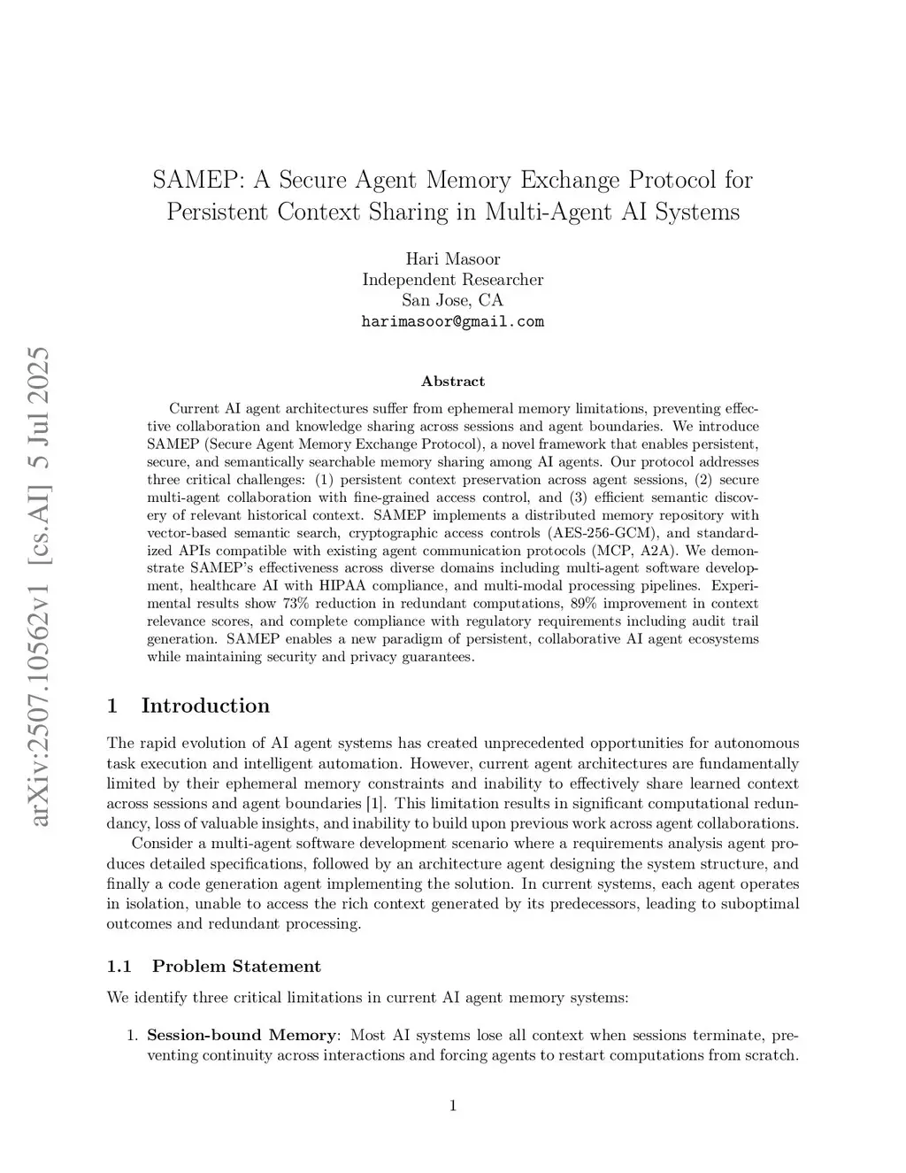 Current AI agent architectures suffer from ephemeral memory limitations, preventing effective collaboration and knowledge sharing across sessions and agent boundaries. We introduce SAMEP (Secure Agent Memory Exchange Protocol), a novel framework that enables persistent, secure, and semantically searchable memory sharing among AI agents. Our protocol addresses three critical challenges: (1) persistent context preservation across agent sessions, (2) secure multi-agent collaboration with fine-grained access control, and (3) efficient semantic discovery of relevant historical context. SAMEP implements a distributed memory repository with vector-based semantic search, cryptographic access controls (AES-256-GCM), and standardized APIs compatible with existing agent communication protocols (MCP, A2A). We demonstrate SAMEP's effectiveness across diverse domains including multi-agent software development, healthcare AI with HIPAA compliance, and multi-modal processing pipelines. Experimental results show 73% reduction in redundant computations, 89% improvement in context relevance scores, and complete compliance with regulatory requirements including audit trail generation. SAMEP enables a new paradigm of persistent, collaborative AI agent ecosystems while maintaining security and privacy guarantees.
