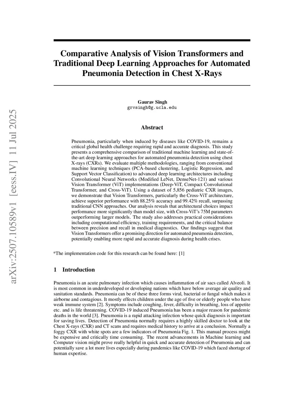 Pneumonia, particularly when induced by diseases like COVID-19, remains a critical global health challenge requiring rapid and accurate diagnosis. This study presents a comprehensive comparison of traditional machine learning and state-of-the-art deep learning approaches for automated pneumonia detection using chest X-rays (CXRs). We evaluate multiple methodologies, ranging from conventional machine learning techniques (PCA-based clustering, Logistic Regression, and Support Vector Classification) to advanced deep learning architectures including Convolutional Neural Networks (Modified LeNet, DenseNet-121) and various Vision Transformer (ViT) implementations (Deep-ViT, Compact Convolutional Transformer, and Cross-ViT). Using a dataset of 5,856 pediatric CXR images, we demonstrate that Vision Transformers, particularly the Cross-ViT architecture, achieve superior performance with 88.25% accuracy and 99.42% recall, surpassing traditional CNN approaches. Our analysis reveals that architectural choices impact performance more significantly than model size, with Cross-ViT's 75M parameters outperforming larger models. The study also addresses practical considerations including computational efficiency, training requirements, and the critical balance between precision and recall in medical diagnostics. Our findings suggest that Vision Transformers offer a promising direction for automated pneumonia detection, potentially enabling more rapid and accurate diagnosis during health crises.