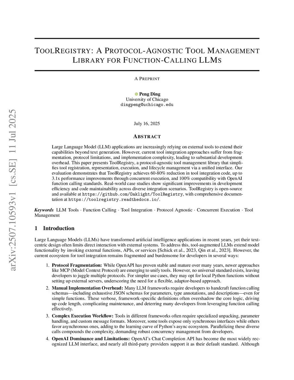 Large Language Model (LLM) applications are increasingly relying on external tools to extend their capabilities beyond text generation. However, current tool integration approaches suffer from fragmentation, protocol limitations, and implementation complexity, leading to substantial development overhead. This paper presents Toolregistry, a protocol-agnostic tool management library that simplifies tool registration, representation, execution, and lifecycle management via a unified interface. Our evaluation demonstrates that \toolregistry achieves 60-80% reduction in tool integration code, up to 3.1x performance improvements through concurrent execution, and 100% compatibility with OpenAI function calling standards. Real-world case studies show significant improvements in development efficiency and code maintainability across diverse integration scenarios. \toolregistry is open-source and available atthis https URL, with comprehensive documentation atthis https URL.