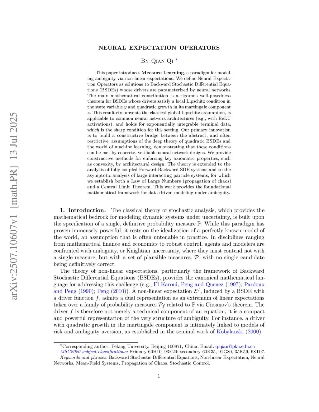 This paper introduces \textbf{Measure Learning}, a paradigm for modeling ambiguity via non-linear expectations. We define Neural Expectation Operators as solutions to Backward Stochastic Differential Equations (BSDEs) whose drivers are parameterized by neural networks. The main mathematical contribution is a rigorous well-posedness theorem for BSDEs whose drivers satisfy a local Lipschitz condition in the state variable and quadratic growth in its martingale component . This result circumvents the classical global Lipschitz assumption, is applicable to common neural network architectures (e.g., with ReLU activations), and holds for exponentially integrable terminal data, which is the sharp condition for this setting. Our primary innovation is to build a constructive bridge between the abstract, and often restrictive, assumptions of the deep theory of quadratic BSDEs and the world of machine learning, demonstrating that these conditions can be met by concrete, verifiable neural network designs. We provide constructive methods for enforcing key axiomatic properties, such as convexity, by architectural design. The theory is extended to the analysis of fully coupled Forward-Backward SDE systems and to the asymptotic analysis of large interacting particle systems, for which we establish both a Law of Large Numbers (propagation of chaos) and a Central Limit Theorem. This work provides the foundational mathematical framework for data-driven modeling under ambiguity.