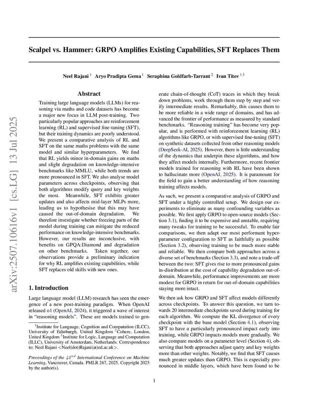 Scalpel vs. Hammer: GRPO Amplifies Existing Capabilities, SFT Replaces Them
