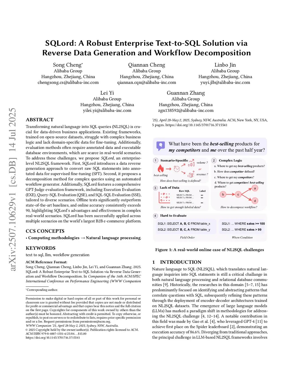 Transforming natural language into SQL queries (NL2SQL) is crucial for data-driven business applications. Existing frameworks, trained on open-source datasets, struggle with complex business logic and lack domain-specific data for fine-tuning. Additionally, evaluation methods often require annotated data and executable database environments, which are scarce in real-world scenarios. To address these challenges, we propose SQLord, an enterprise-level NL2SQL framework. First, SQLord introduces a data reverse generation approach to convert raw SQL statements into annotated data for supervised fine-tuning (SFT). Second, it proposes a decomposition method for complex queries using an automated workflow generator. Additionally, SQLord features a comprehensive GPT-Judge evaluation framework, including Execution Evaluation (EXE), Query-SQL Evaluation (QSE), and SQL-SQL Evaluation (SSE), tailored to diverse scenarios. Offline tests significantly outperform state of the art baselines, and online accuracy consistently exceeds 90, highlighting SQLord's advantages and effectiveness in complex real world scenarios. SQLord has been successfully applied across multiple scenarios on the world's largest B2B e-commerce platform.