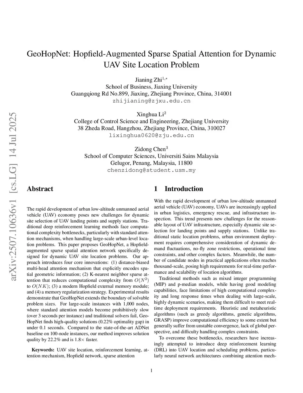 The rapid development of urban low-altitude unmanned aerial vehicle (UAV) economy poses new challenges for dynamic site selection of UAV landing points and supply stations. Traditional deep reinforcement learning methods face computational complexity bottlenecks, particularly with standard attention mechanisms, when handling large-scale urban-level location problems. This paper proposes GeoHopNet, a Hopfield-augmented sparse spatial attention network specifically designed for dynamic UAV site location problems. Our approach introduces four core innovations: (1) distance-biased multi-head attention mechanism that explicitly encodes spatial geometric information; (2) K-nearest neighbor sparse attention that reduces computational complexity from to ; (3) a modern Hopfield external memory module; and (4) a memory regularization strategy. Experimental results demonstrate that GeoHopNet extends the boundary of solvable problem sizes. For large-scale instances with 1,000 nodes, where standard attention models become prohibitively slow (over 3 seconds per instance) and traditional solvers fail, GeoHopNet finds high-quality solutions (0.22\% optimality gap) in under 0.1 seconds. Compared to the state-of-the-art ADNet baseline on 100-node instances, our method improves solution quality by 22.2\% and is 1.8 faster.