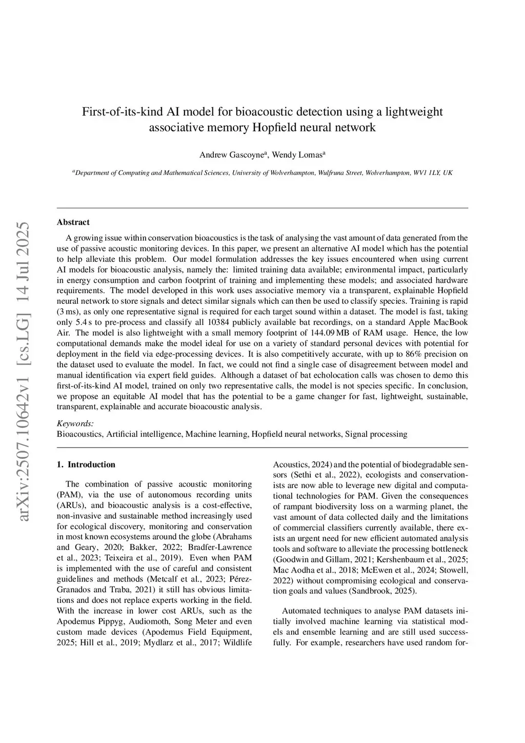 First-of-its-kind AI model for bioacoustic detection using a lightweight associative memory Hopfield neural network
