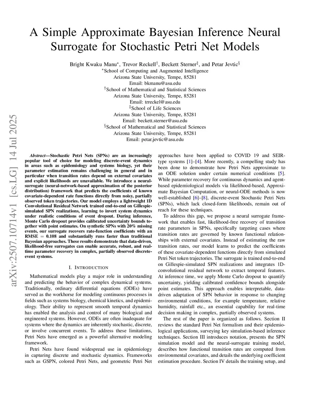 Stochastic Petri Nets (SPNs) are an increasingly popular tool of choice for modeling discrete-event dynamics in areas such as epidemiology and systems biology, yet their parameter estimation remains challenging in general and in particular when transition rates depend on external covariates and explicit likelihoods are unavailable. We introduce a neural-surrogate (neural-network-based approximation of the posterior distribution) framework that predicts the coefficients of known covariate-dependent rate functions directly from noisy, partially observed token trajectories. Our model employs a lightweight 1D Convolutional Residual Network trained end-to-end on Gillespie-simulated SPN realizations, learning to invert system dynamics under realistic conditions of event dropout. During inference, Monte Carlo dropout provides calibrated uncertainty bounds together with point estimates. On synthetic SPNs with missing events, our surrogate recovers rate-function coefficients with an and substantially runs faster than traditional Bayesian approaches. These results demonstrate that data-driven, likelihood-free surrogates can enable accurate, robust, and real-time parameter recovery in complex, partially observed discrete-event systems.