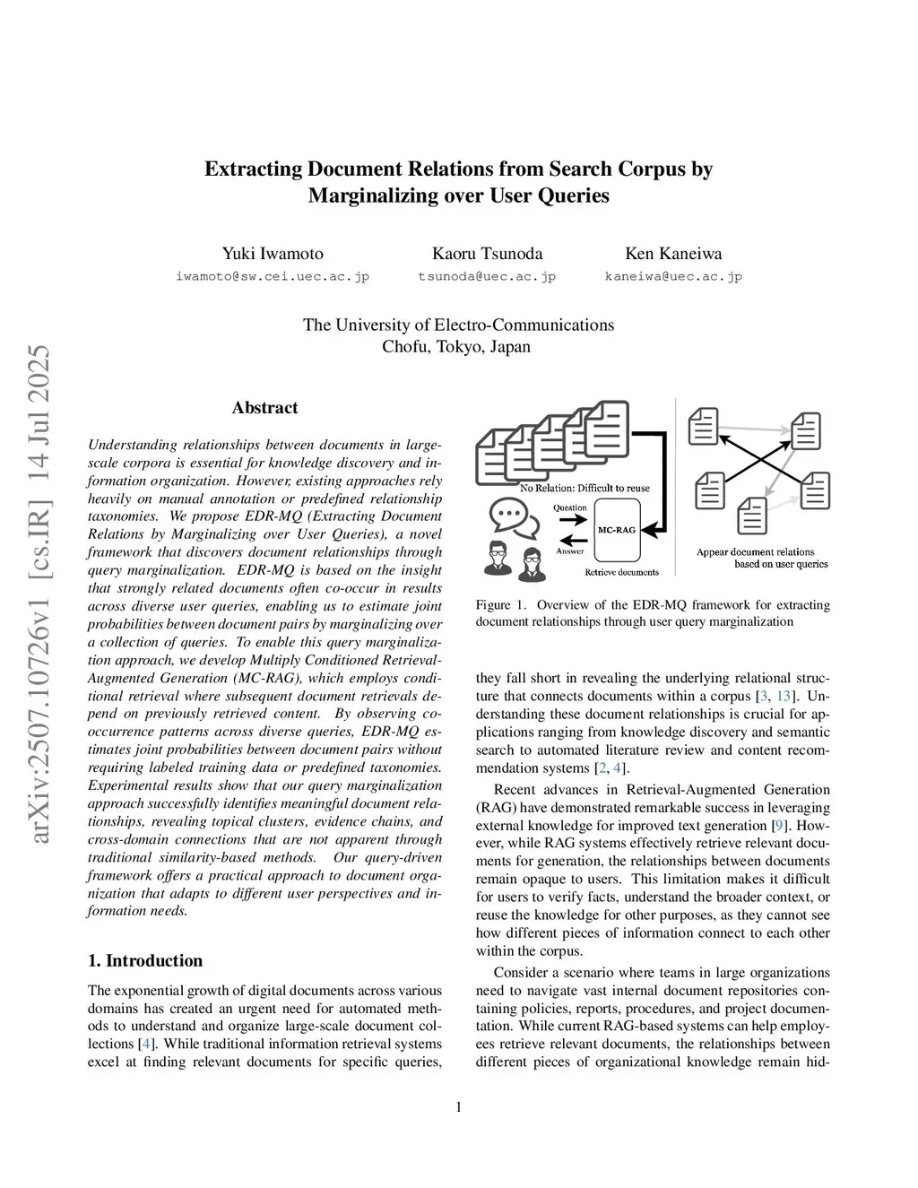 Understanding relationships between documents in large-scale corpora is essential for knowledge discovery and information organization. However, existing approaches rely heavily on manual annotation or predefined relationship taxonomies. We propose EDR-MQ (Extracting Document Relations by Marginalizing over User Queries), a novel framework that discovers document relationships through query marginalization. EDR-MQ is based on the insight that strongly related documents often co-occur in results across diverse user queries, enabling us to estimate joint probabilities between document pairs by marginalizing over a collection of queries. To enable this query marginalization approach, we develop Multiply Conditioned Retrieval-Augmented Generation (MC-RAG), which employs conditional retrieval where subsequent document retrievals depend on previously retrieved content. By observing co-occurrence patterns across diverse queries, EDR-MQ estimates joint probabilities between document pairs without requiring labeled training data or predefined taxonomies. Experimental results show that our query marginalization approach successfully identifies meaningful document relationships, revealing topical clusters, evidence chains, and cross-domain connections that are not apparent through traditional similarity-based methods. Our query-driven framework offers a practical approach to document organization that adapts to different user perspectives and information needs.