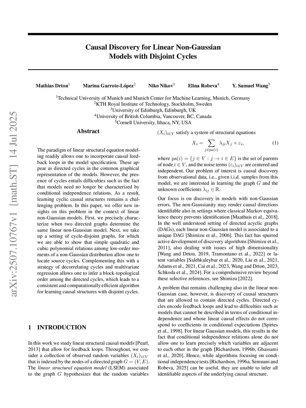 The paradigm of linear structural equation modeling readily allows one to incorporate causal feedback loops in the model specification. These appear as directed cycles in the common graphical representation of the models. However, the presence of cycles entails difficulties such as the fact that models need no longer be characterized by conditional independence relations. As a result, learning cyclic causal structures remains a challenging problem. In this paper, we offer new insights on this problem in the context of linear non-Gaussian models. First, we precisely characterize when two directed graphs determine the same linear non-Gaussian model. Next, we take up a setting of cycle-disjoint graphs, for which we are able to show that simple quadratic and cubic polynomial relations among low-order moments of a non-Gaussian distribution allow one to locate source cycles. Complementing this with a strategy of decorrelating cycles and multivariate regression allows one to infer a block-topological order among the directed cycles, which leads to a {consistent and computationally efficient algorithm} for learning causal structures with disjoint cycles.
