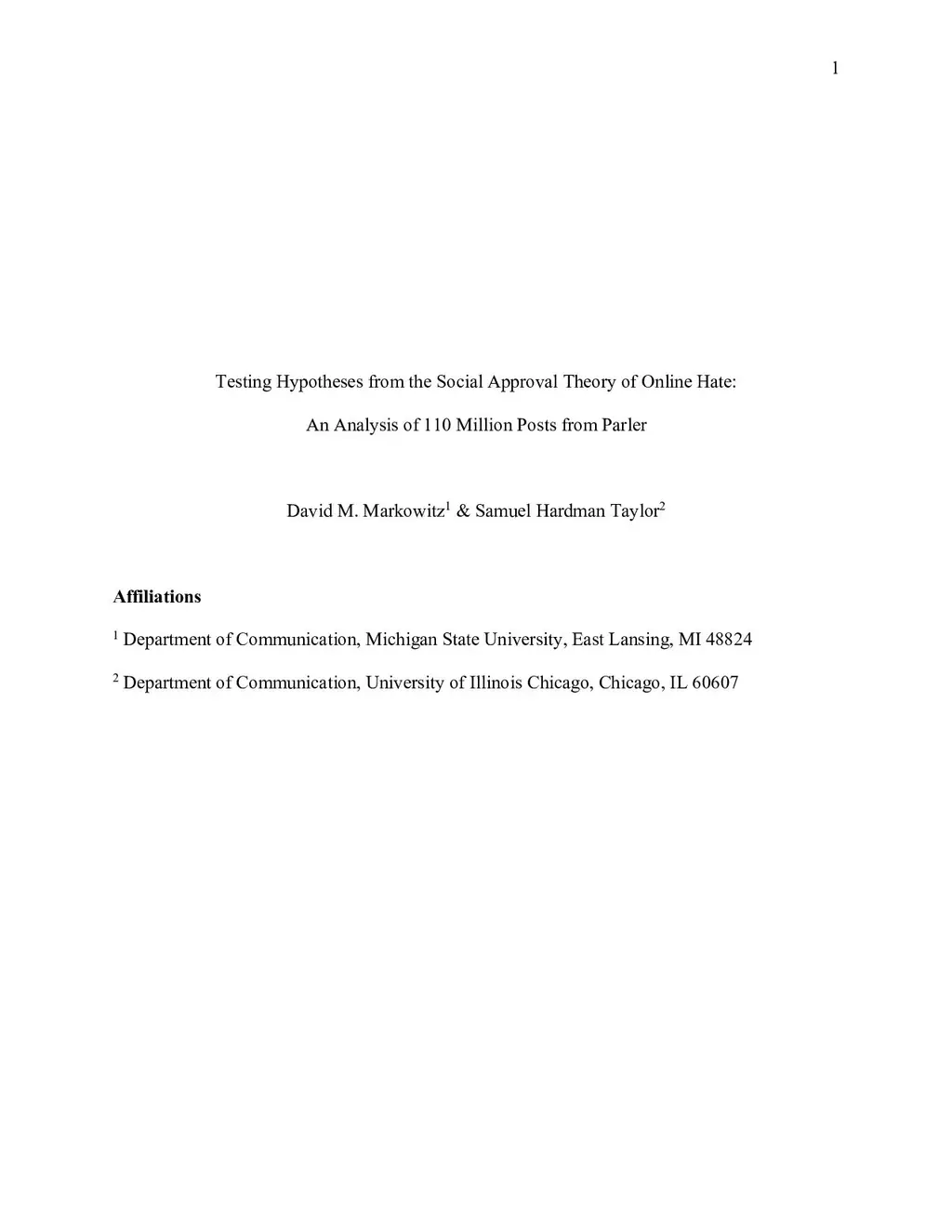 Testing Hypotheses from the Social Approval Theory of Online Hate: An Analysis of 110 Million Messages from Parler