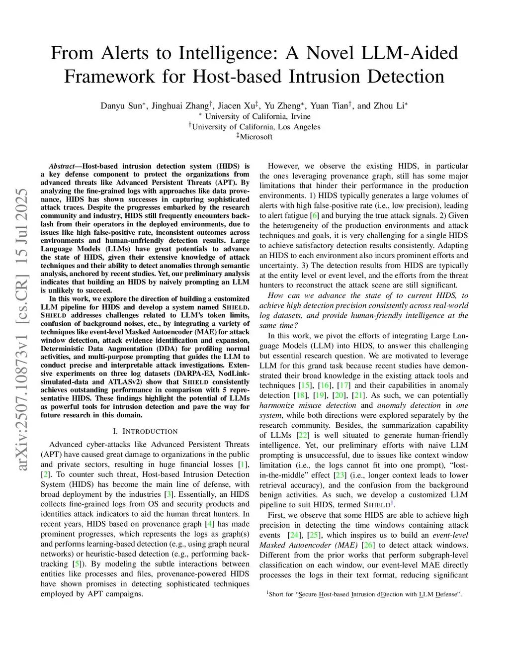 Host-based intrusion detection system (HIDS) is a key defense component to protect the organizations from advanced threats like Advanced Persistent Threats (APT). By analyzing the fine-grained logs with approaches like data provenance, HIDS has shown successes in capturing sophisticated attack traces. Despite the progresses embarked by the research community and industry, HIDS still frequently encounters backlash from their operators in the deployed environments, due to issues like high false-positive rate, inconsistent outcomes across environments and human-unfriendly detection results. Large Language Models (LLMs) have great potentials to advance the state of HIDS, given their extensive knowledge of attack techniques and their ability to detect anomalies through semantic analysis, anchored by recent studies. Yet, our preliminary analysis indicates that building an HIDS by naively prompting an LLM is unlikely to succeed. In this work, we explore the direction of building a customized LLM pipeline for HIDS and develop a system named SHIELD. SHIELD addresses challenges related to LLM's token limits, confusion of background noises, etc., by integrating a variety of techniques like event-level Masked Autoencoder (MAE) for attack window detection, attack evidence identification and expansion, Deterministic Data Augmentation (DDA) for profiling normal activities, and multi-purpose prompting that guides the LLM to conduct precise and interpretable attack investigations. Extensive experiments on three log datasets (DARPA-E3, NodLink-simulated-data and ATLASv2) show that SHIELD consistently achieves outstanding performance in comparison with 5 representative HIDS. These findings highlight the potential of LLMs as powerful tools for intrusion detection and pave the way for future research in this domain.