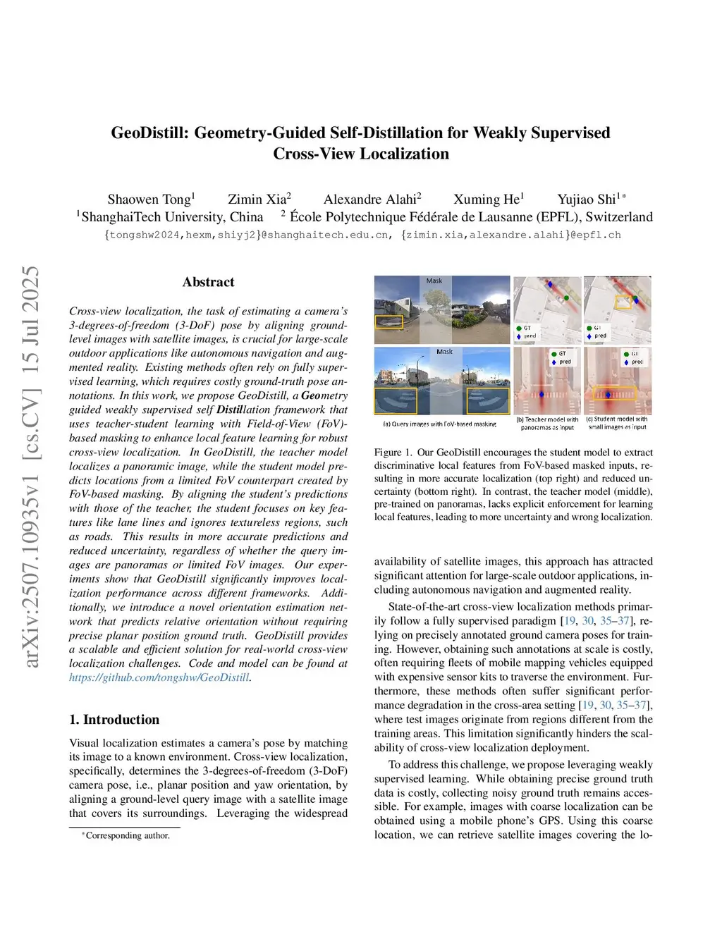 Cross-view localization, the task of estimating a camera's 3-degrees-of-freedom (3-DoF) pose by aligning ground-level images with satellite images, is crucial for large-scale outdoor applications like autonomous navigation and augmented reality. Existing methods often rely on fully supervised learning, which requires costly ground-truth pose annotations. In this work, we propose GeoDistill, a Geometry guided weakly supervised self distillation framework that uses teacher-student learning with Field-of-View (FoV)-based masking to enhance local feature learning for robust cross-view localization. In GeoDistill, the teacher model localizes a panoramic image, while the student model predicts locations from a limited FoV counterpart created by FoV-based masking. By aligning the student's predictions with those of the teacher, the student focuses on key features like lane lines and ignores textureless regions, such as roads. This results in more accurate predictions and reduced uncertainty, regardless of whether the query images are panoramas or limited FoV images. Our experiments show that GeoDistill significantly improves localization performance across different frameworks. Additionally, we introduce a novel orientation estimation network that predicts relative orientation without requiring precise planar position ground truth. GeoDistill provides a scalable and efficient solution for real-world cross-view localization challenges. Code and model can be found atthis https URL.