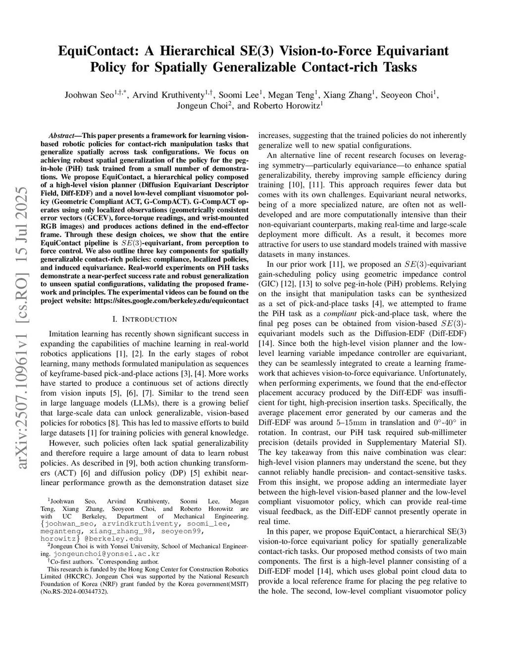 This paper presents a framework for learning vision-based robotic policies for contact-rich manipulation tasks that generalize spatially across task configurations. We focus on achieving robust spatial generalization of the policy for the peg-in-hole (PiH) task trained from a small number of demonstrations. We propose EquiContact, a hierarchical policy composed of a high-level vision planner (Diffusion Equivariant Descriptor Field, Diff-EDF) and a novel low-level compliant visuomotor policy (Geometric Compliant ACT, G-CompACT). G-CompACT operates using only localized observations (geometrically consistent error vectors (GCEV), force-torque readings, and wrist-mounted RGB images) and produces actions defined in the end-effector frame. Through these design choices, we show that the entire EquiContact pipeline is SE(3)-equivariant, from perception to force control. We also outline three key components for spatially generalizable contact-rich policies: compliance, localized policies, and induced equivariance. Real-world experiments on PiH, screwing, and surface wiping tasks demonstrate a near-perfect success rate and robust generalization to unseen spatial configurations, validating the proposed framework and principles. The experimental videos and more details can be found on the project website:this https URL