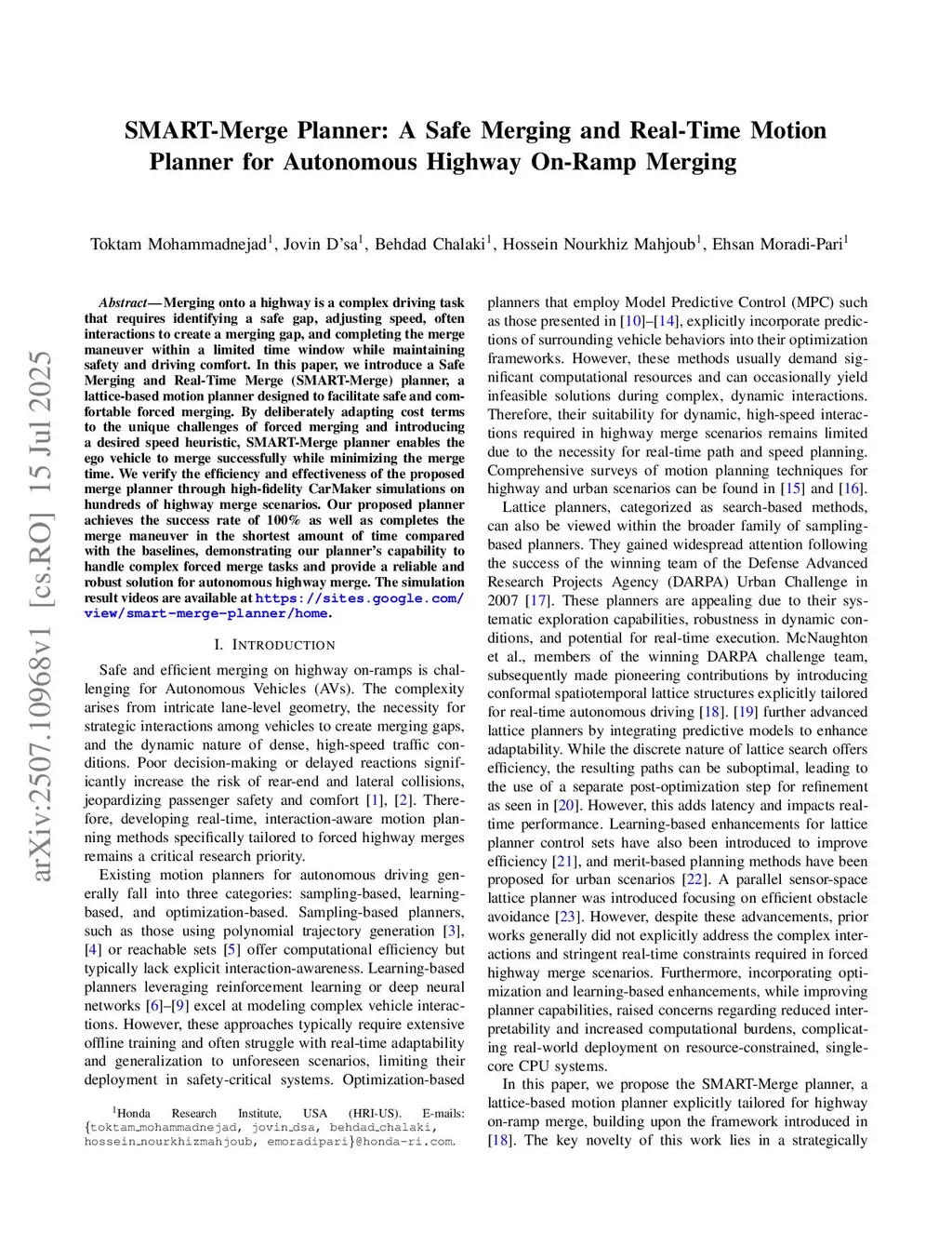 SMART-Merge Planner: A Safe Merging and Real-Time Motion Planner for Autonomous Highway On-Ramp Merging