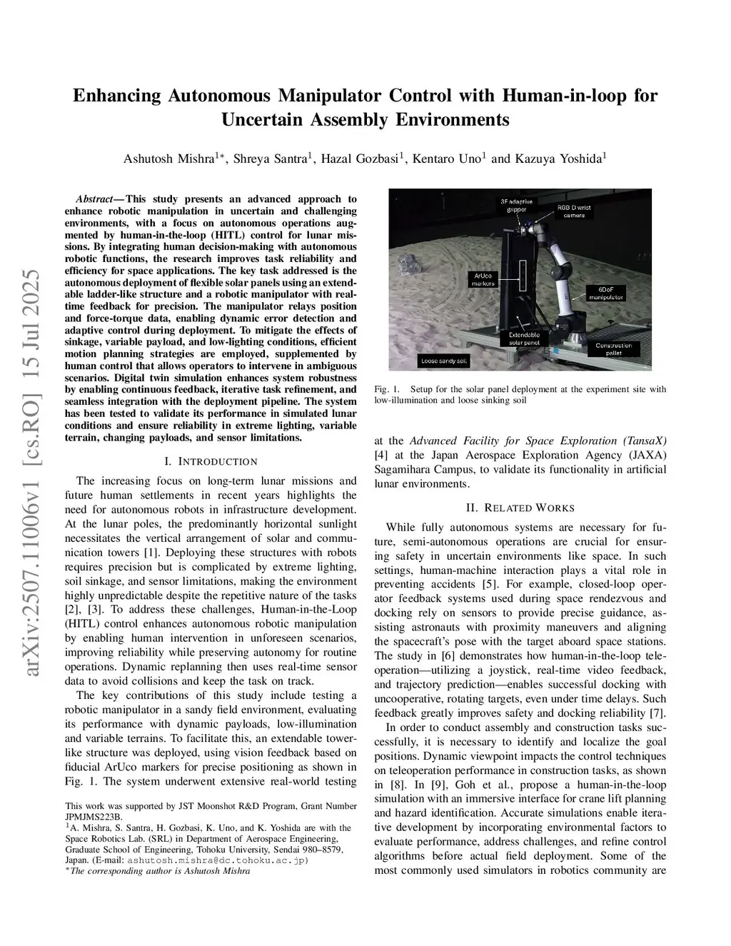 This study presents an advanced approach to enhance robotic manipulation in uncertain and challenging environments, with a focus on autonomous operations augmented by human-in-the-loop (HITL) control for lunar missions. By integrating human decision-making with autonomous robotic functions, the research improves task reliability and efficiency for space applications. The key task addressed is the autonomous deployment of flexible solar panels using an extendable ladder-like structure and a robotic manipulator with real-time feedback for precision. The manipulator relays position and force-torque data, enabling dynamic error detection and adaptive control during deployment. To mitigate the effects of sinkage, variable payload, and low-lighting conditions, efficient motion planning strategies are employed, supplemented by human control that allows operators to intervene in ambiguous scenarios. Digital twin simulation enhances system robustness by enabling continuous feedback, iterative task refinement, and seamless integration with the deployment pipeline. The system has been tested to validate its performance in simulated lunar conditions and ensure reliability in extreme lighting, variable terrain, changing payloads, and sensor limitations.
